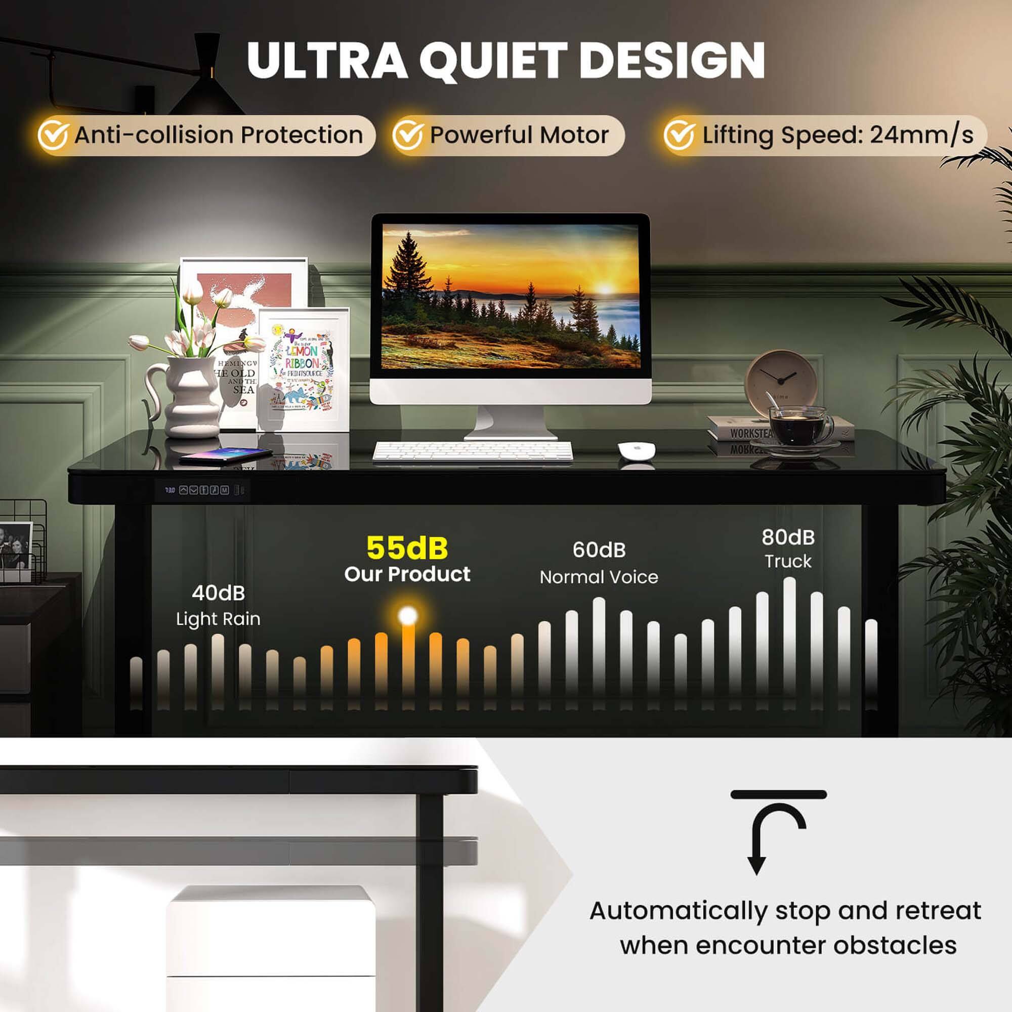 The adjustment slows before coming to a full stop and is not jarring at all and is smooth and whisper-quiet. The desk comes with feet so easily adjusted for any possible silly angles though it was laying perfectly on vinyl directly out of the box. The drawer operates quietly and the structure is very sturdy. And thanks to the glass top (backed by white, so not transparent!) you can use it as a dry erase if that’s your thing. Great desk. Totally worth it!