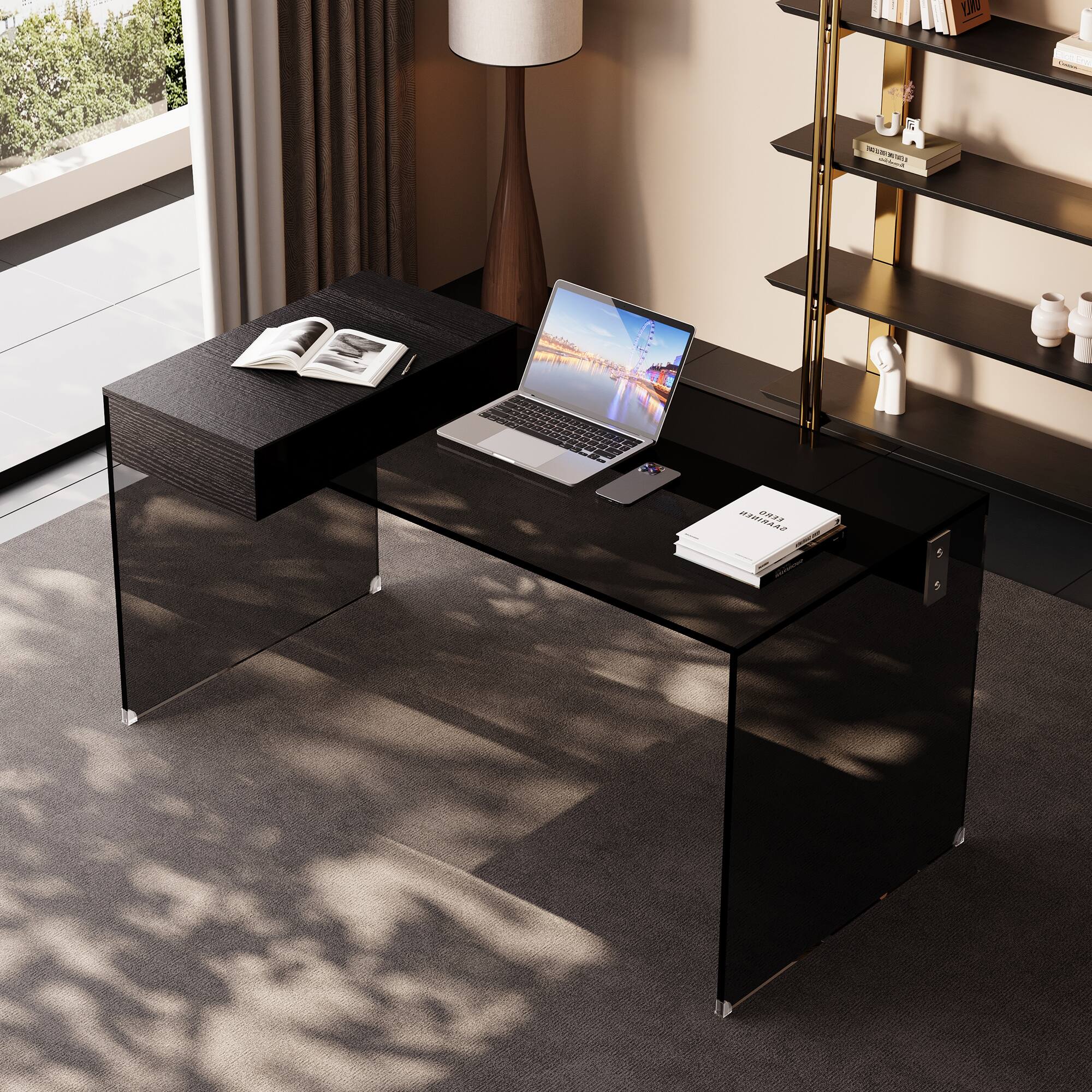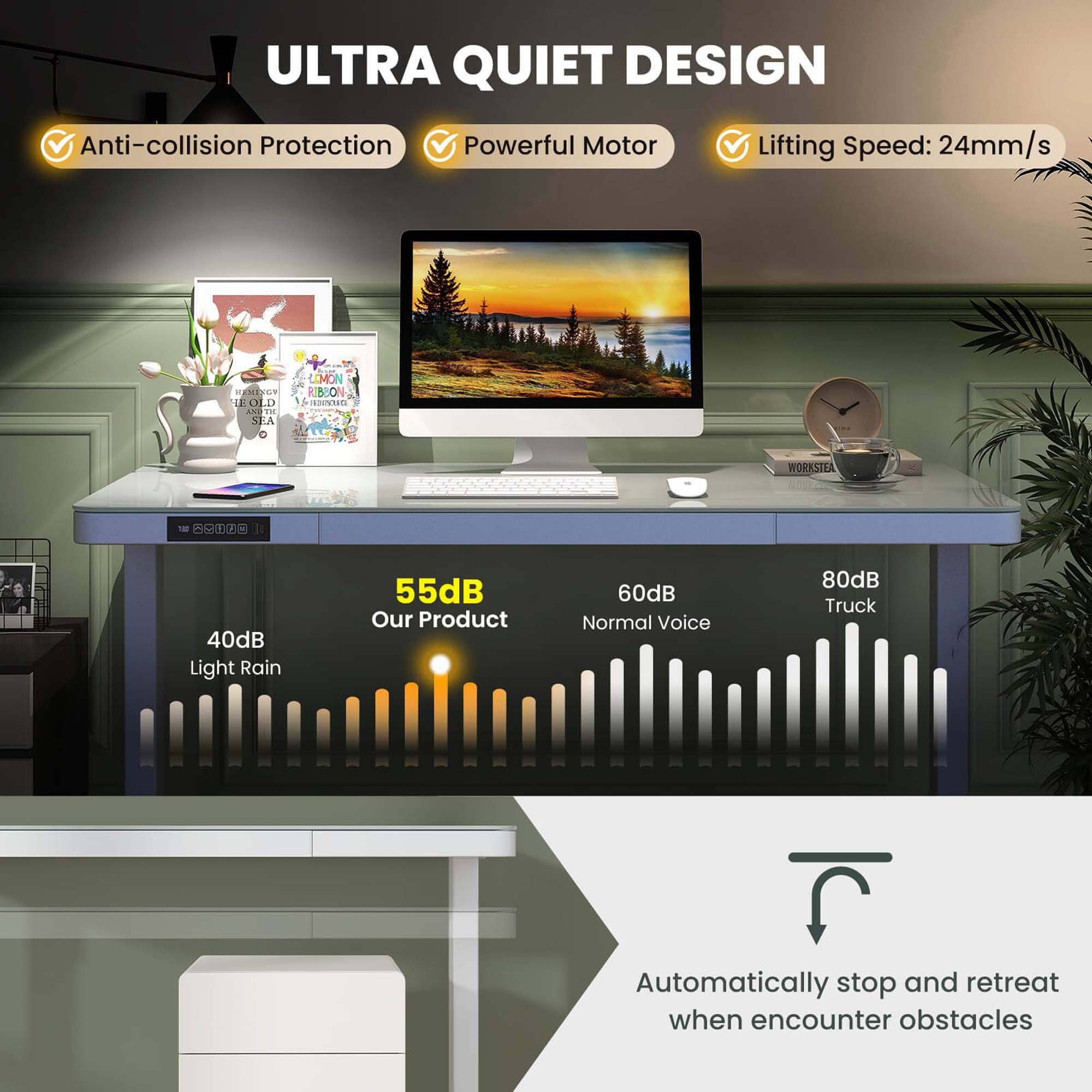 The adjustment slows before coming to a full stop and is not jarring at all and is smooth and whisper-quiet. The desk comes with feet so easily adjusted for any possible silly angles though it was laying perfectly on vinyl directly out of the box. The drawer operates quietly and the structure is very sturdy. And thanks to the glass top (backed by white, so not transparent!) you can use it as a dry erase if that’s your thing. Great desk. Totally worth it!