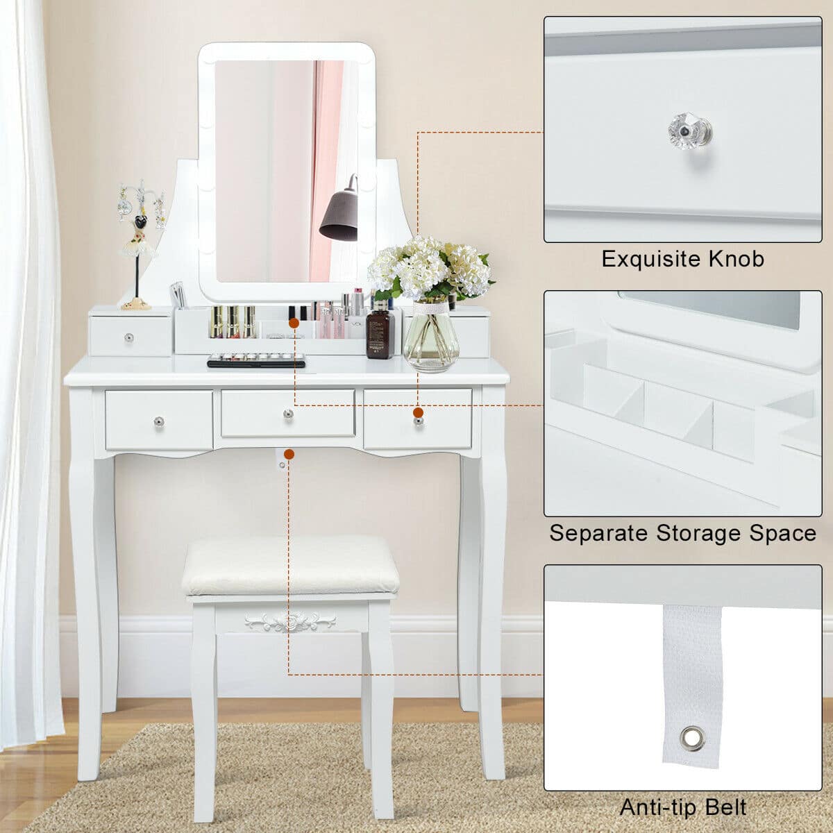 This review is from Costway - Vanity Dressing Table Set w/Removable Box &10 Dimmable Bulbs Touch Switch - Black