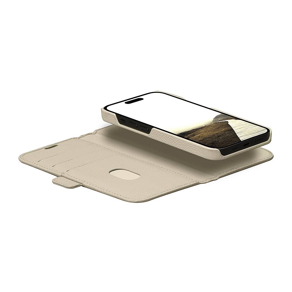 Comes with a nice case with a detachable magnetic folio case or cover. Better in ways to another brand of wallet folio case that I bought in the past (detachable cover, stronger support around the camera lenses, etc.). More expensive than 2 other brands of folio wallet cases (but it was the only brand available for the iPhone 15 Max at Best Buy when I bought the brand). Holds 3 credit cards. Nice forest green case.