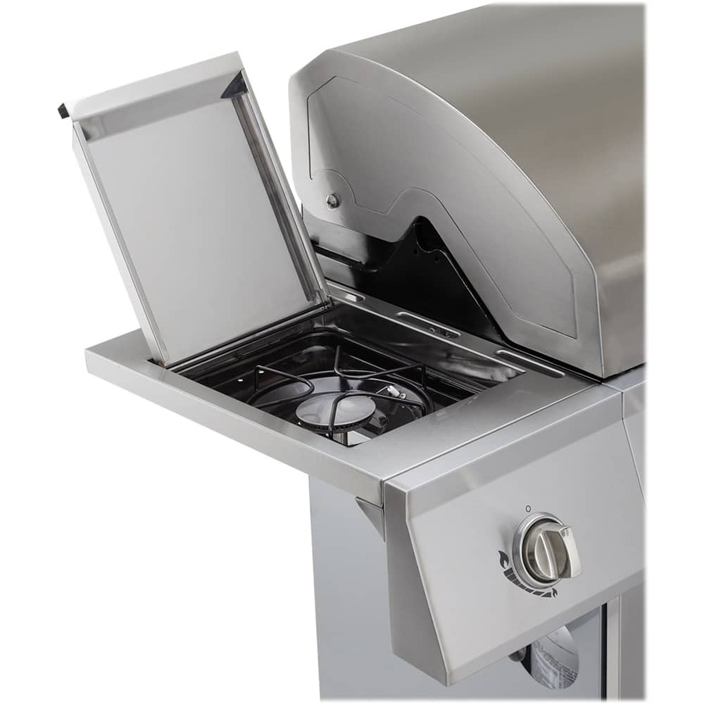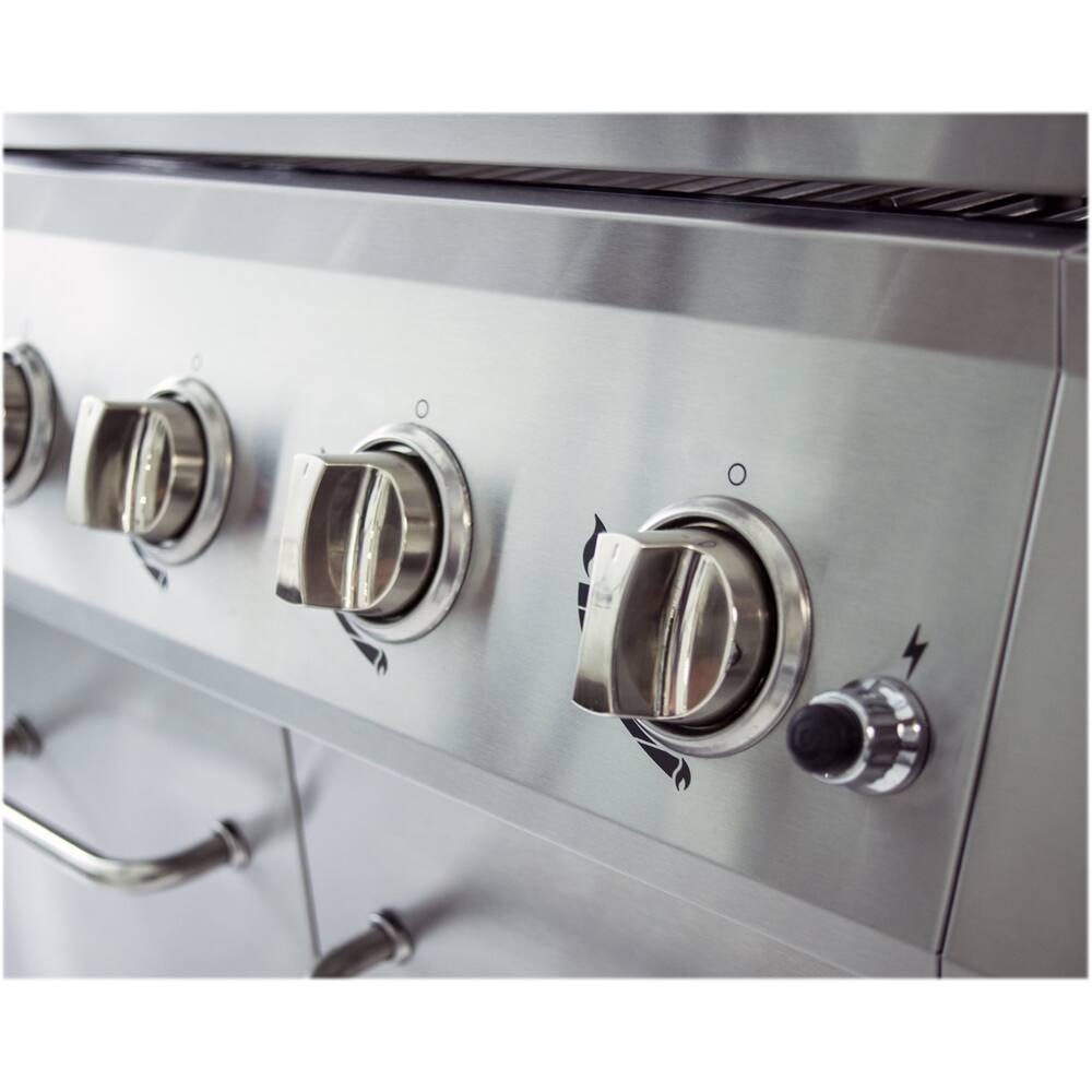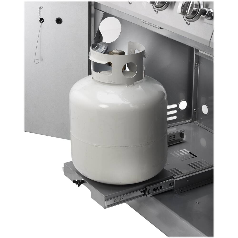 Pros: Larger than standard 4 burner grill. Easy to construct. Awesome SS Cooking Grates, Easy replacement pieces as grill gets old. Easy to keep clean since the WHOLE bottom slides out and has XL Grease Drip Hole and Pan. Pull OUT design for P-Tank, Natural Gas Compatible. Independent Ignition on all burners.