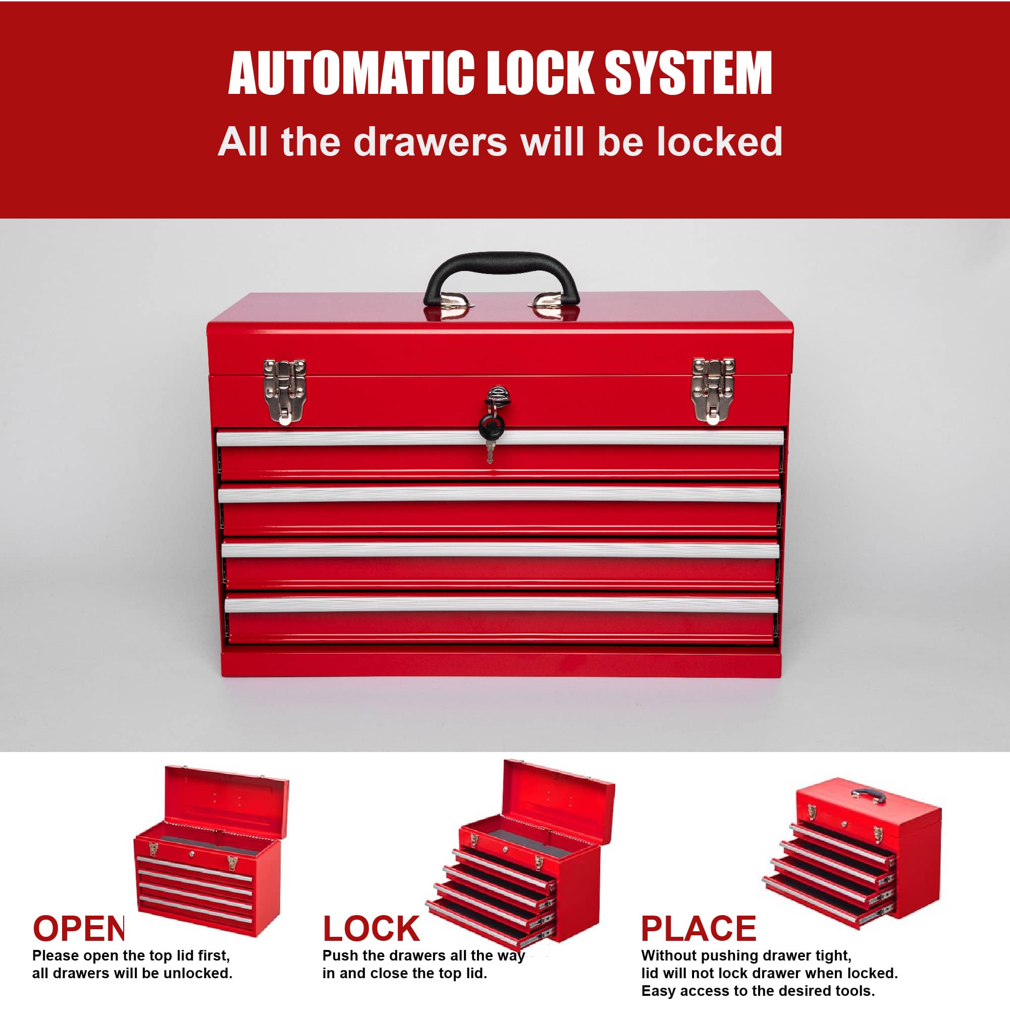 This is a really good toolbox. The red paint finish was perfect. The ball bearing drawers and close very smoothly. I really liked the added extra space on the top.