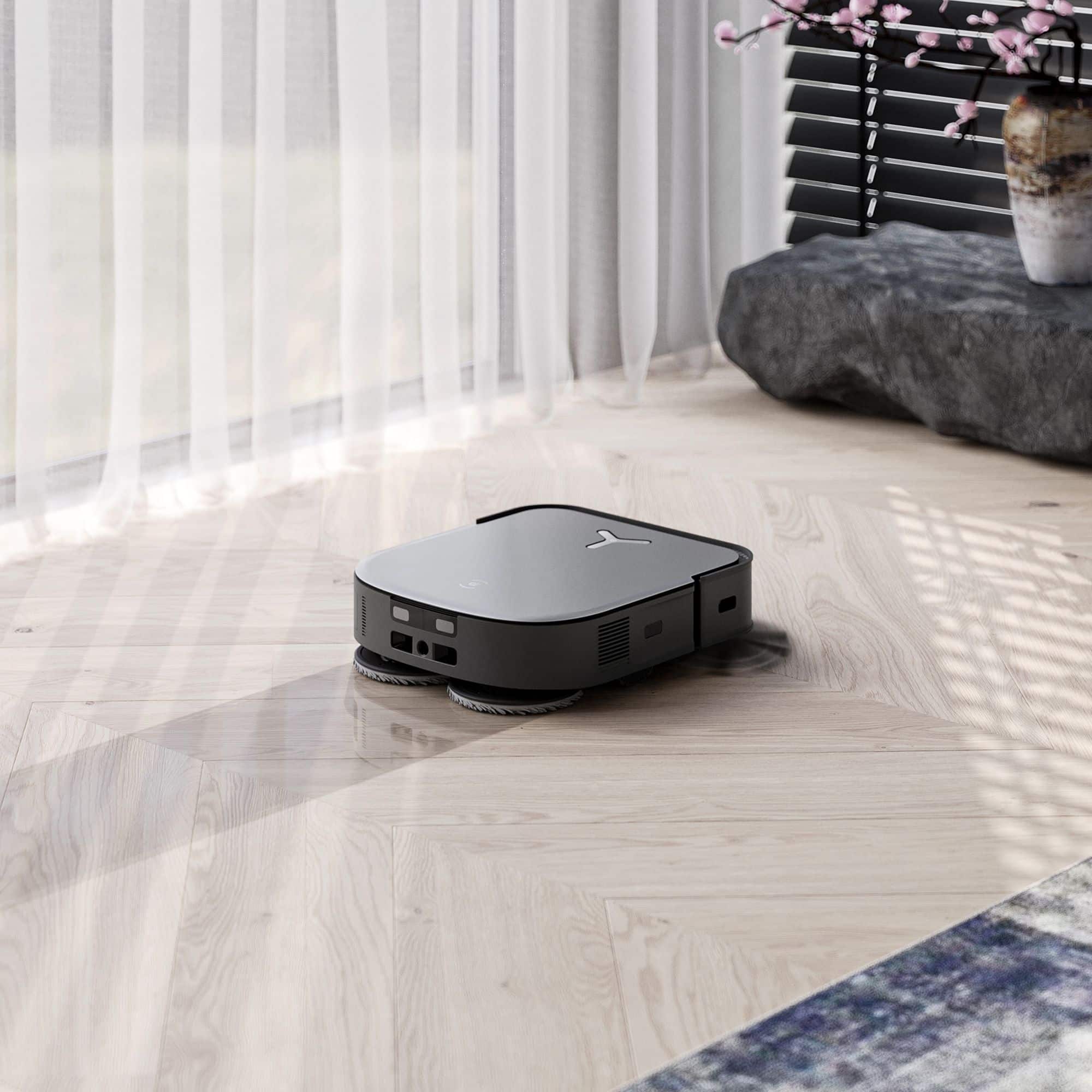 - Base station empties dustbin and cleans/dries mopping pads