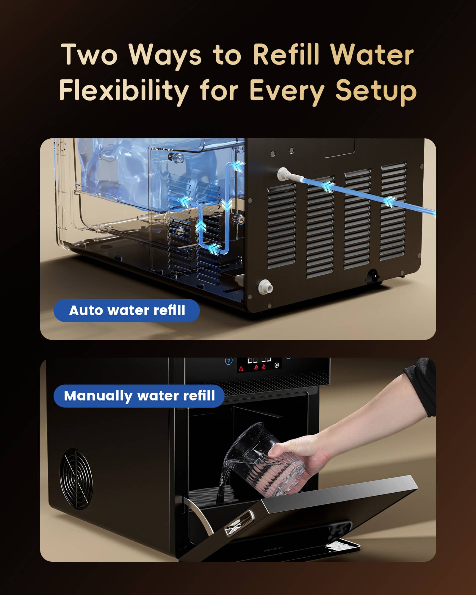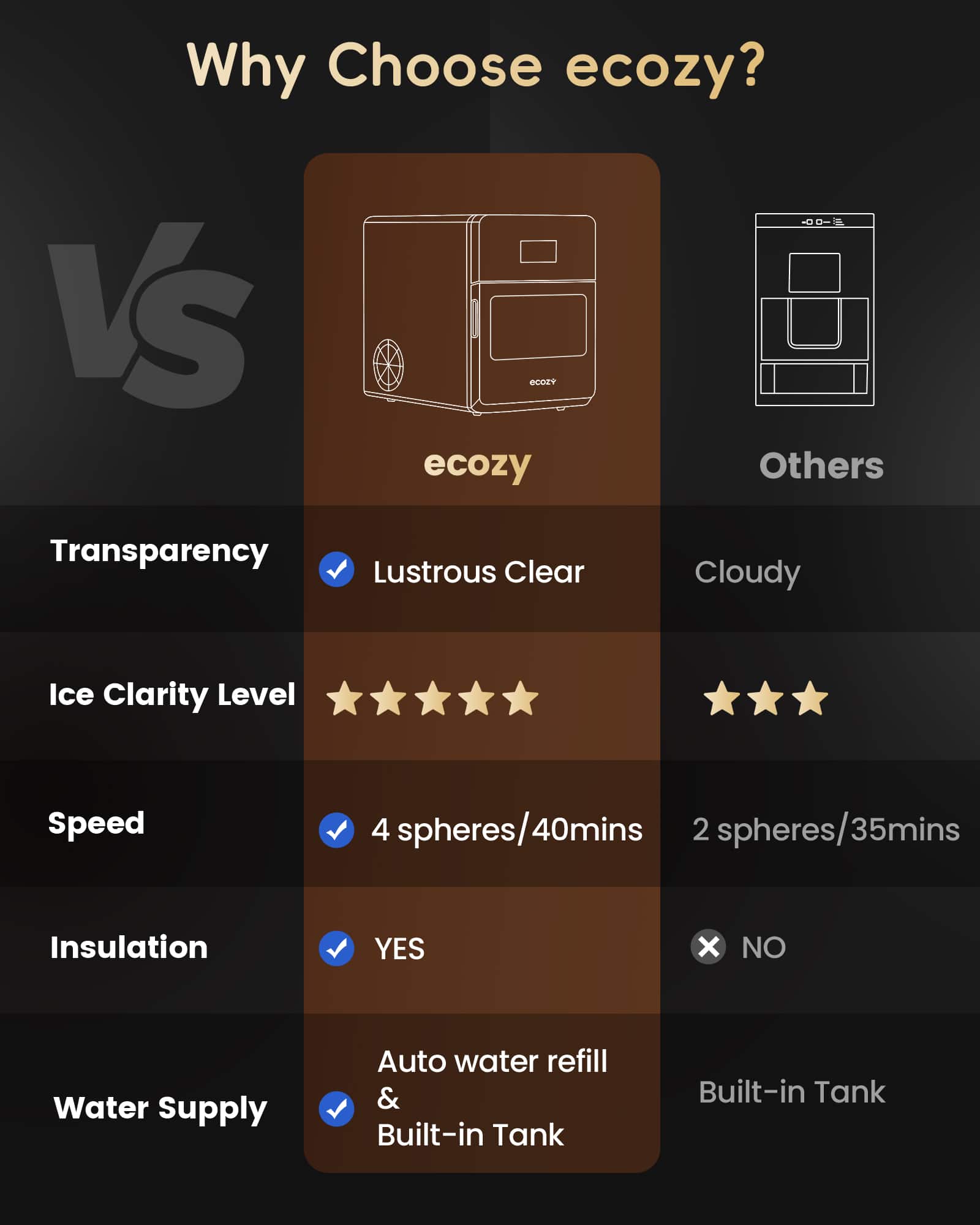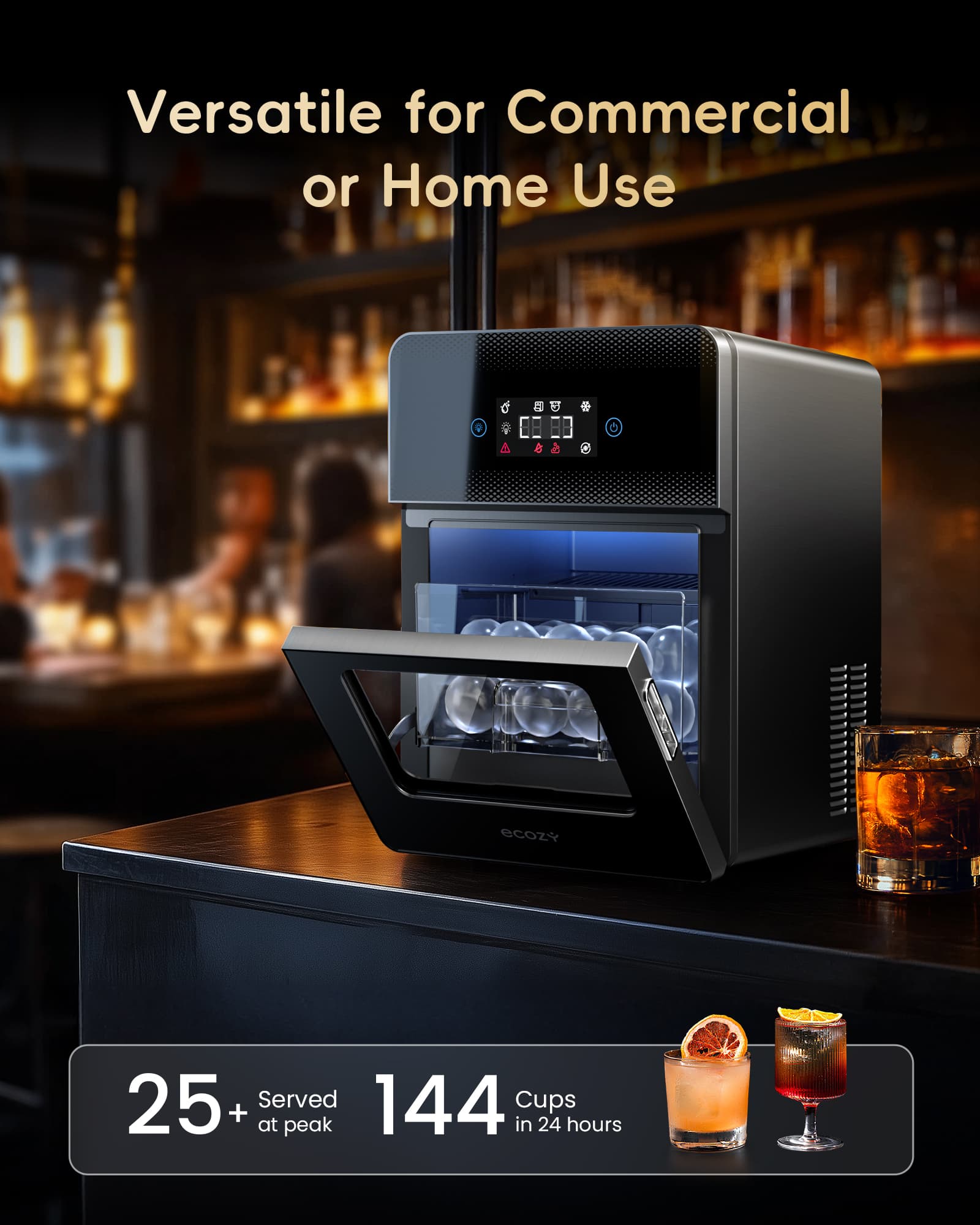 It produces perfectly 2" round, crystal-clear ice spheres, about 8 in a little over an hour—ideal for small groups drinking cocktails, whiskey, or elevating any drink. The dual water fill options are super convenient. I use the water tank function when use it in my backyard. When you want a constant supply of ice, you just have to hook it a constant water line. The self-cleaning function is a huge plus. It’s not that quiet indoor, but out door it won't bother me at all. I really don't notice it that much. It has easy to use with the touch LCD panel, and looks sleek on the counter. Overall functions are excellent and for me it's perfect for the price.