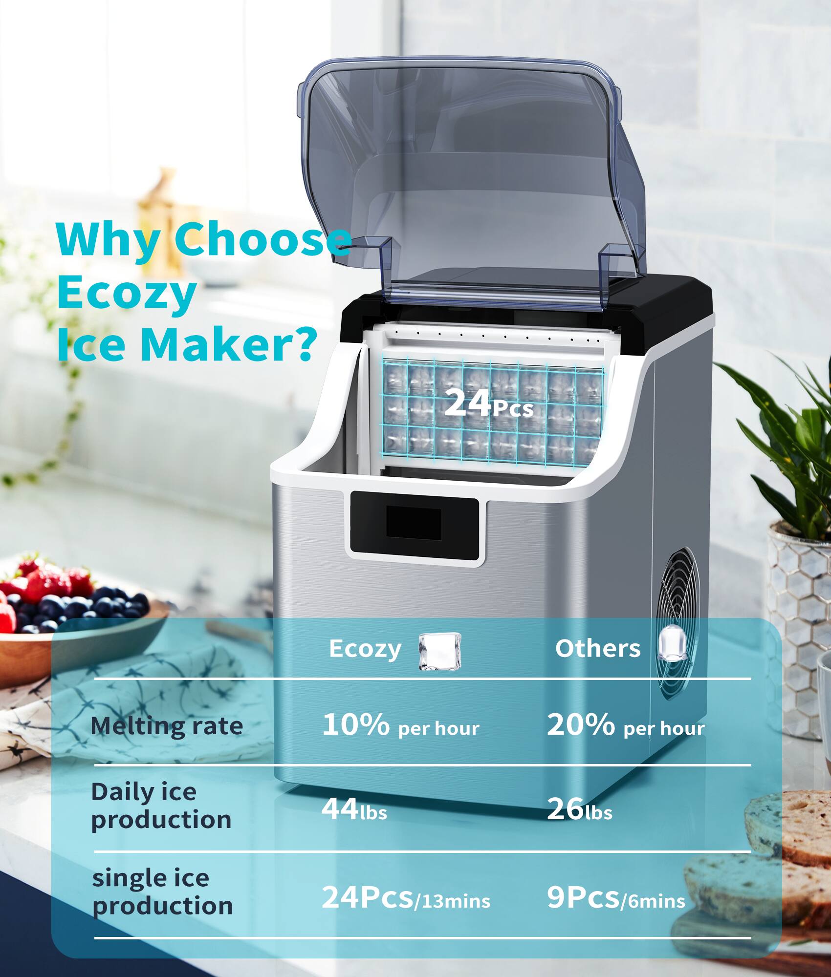This review is from Ecozy - 45lb. Countertop Ice Maker with Auto Self-Cleaning, 45lbs Per Day, 24 Cubes Ready in 13 Mins - Stainless Steel