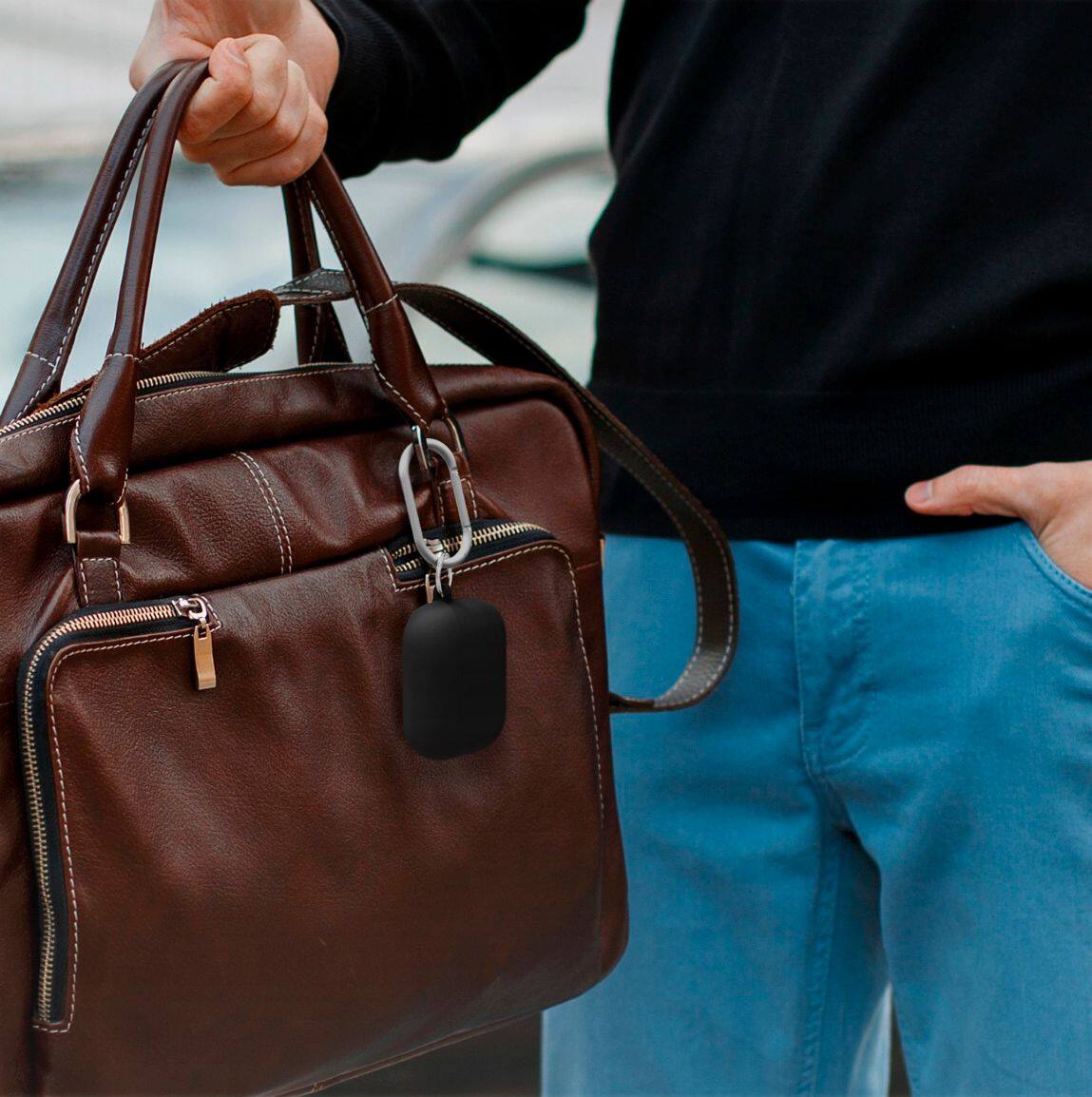 Some of these types of cases require special tape or glue to stay connected to AirPods Pro case. This case is different. It easily stays attached to the case and it also fits nicely on a regular key ring.