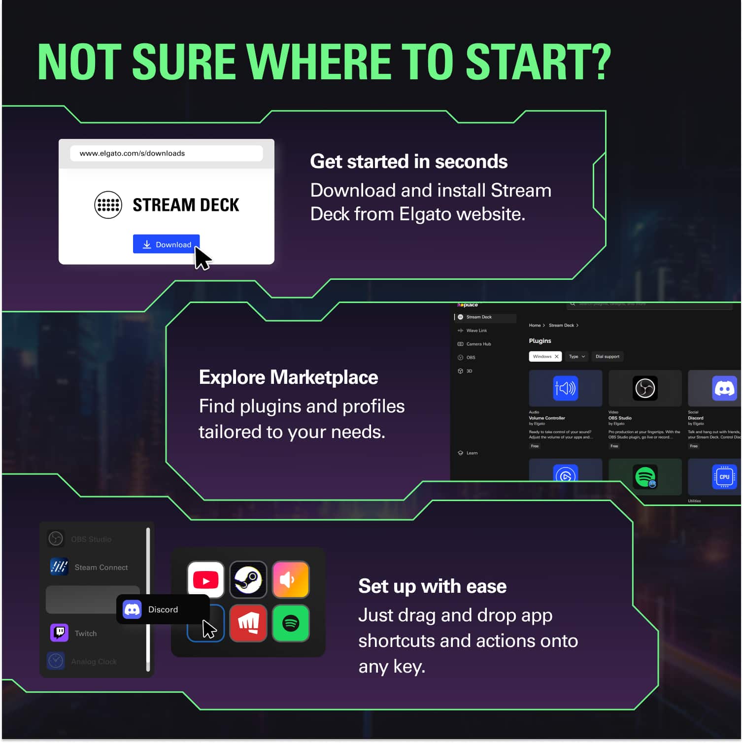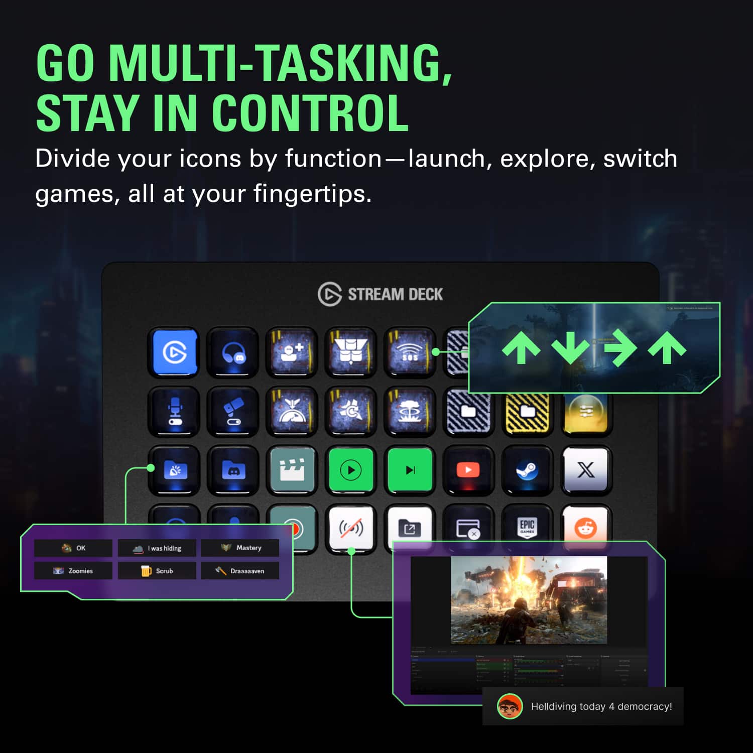 I use the Stream Deck just to simplify things like opening apps, turning on lights, hiding windows, closing apps, and typing.