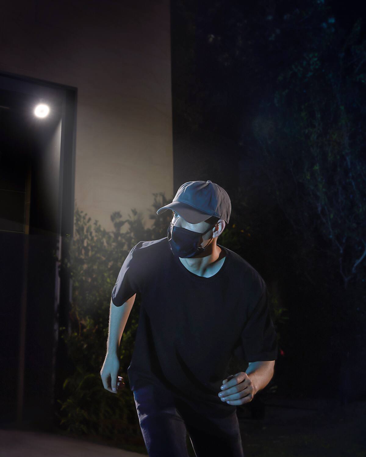 -Picture with Red Car in background and person wearing Blue Tshirt, the camera is about 20ft away. Person came out of side door of house and is about 8ft from the door.