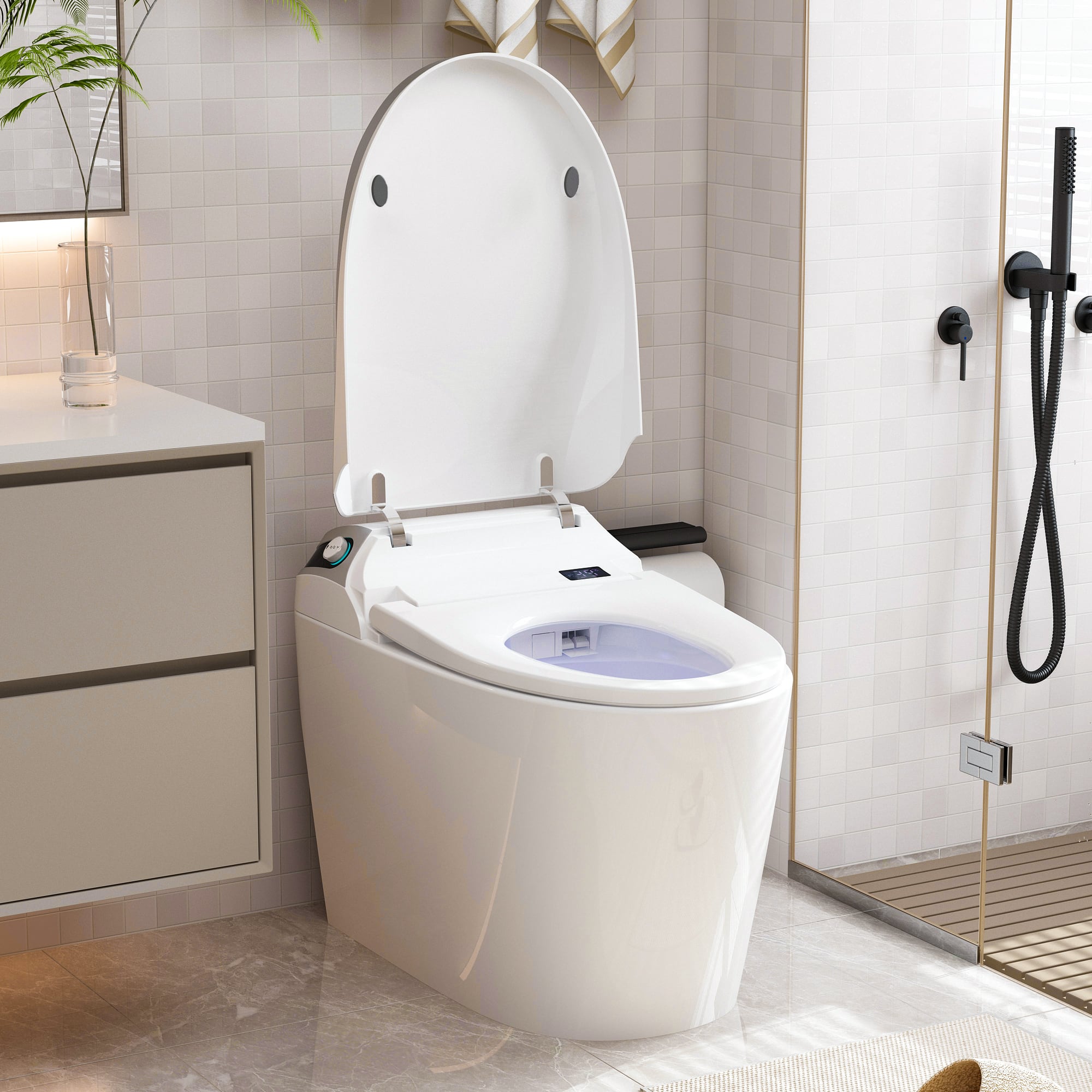 It is like having your own personal throne in the "rest" room . . . warm seat, warm water, warm drying air, night light, opens when you approach, closes later after you leave, has UV cleaning for the spray nozzle, nozzle adjusts for front and rear cleaning, does not require bolts for attachment to the floor, looks elegant and sleek, fits standard 12 inch (305 mm) floor placement from back wall. All in all, a wonderful addition to the master bathroom. Installing it encouraged a full room painting, just to bring the room up to its "new" modern and luxurious appearance.