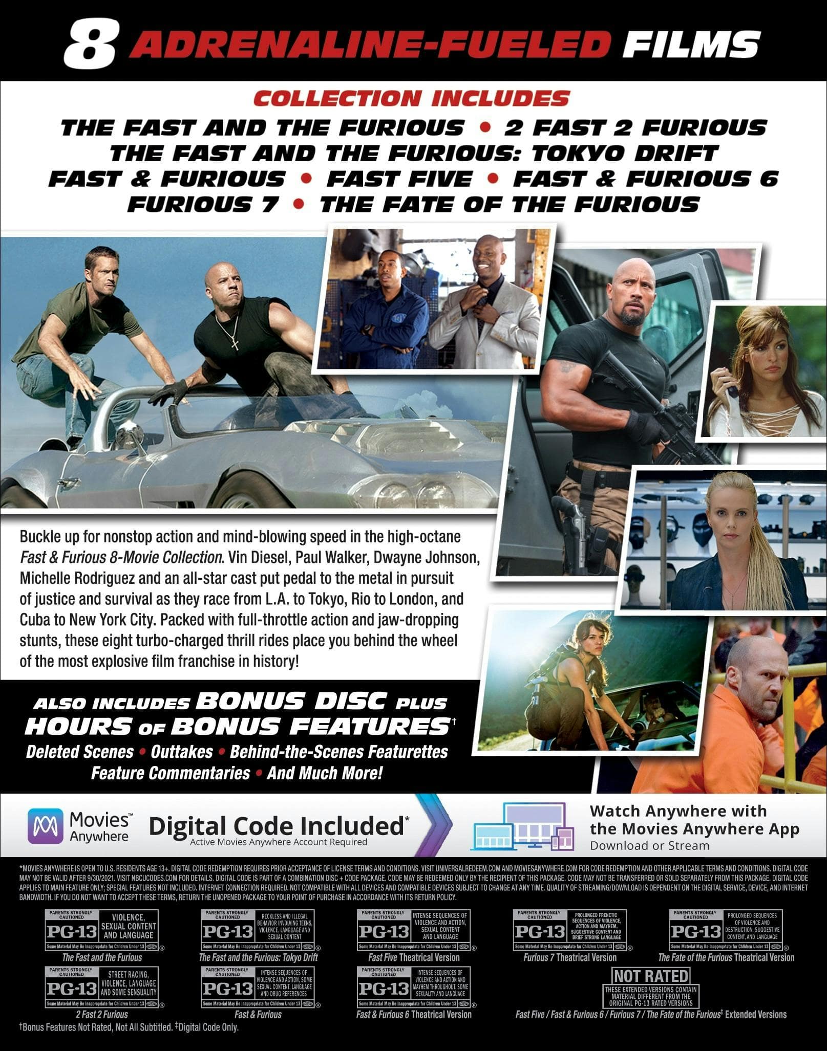 This collection has all of the Fast and Furious franchise with the exception of the latest release. Also included was a extended version of F8. Must have dor fans of the series.