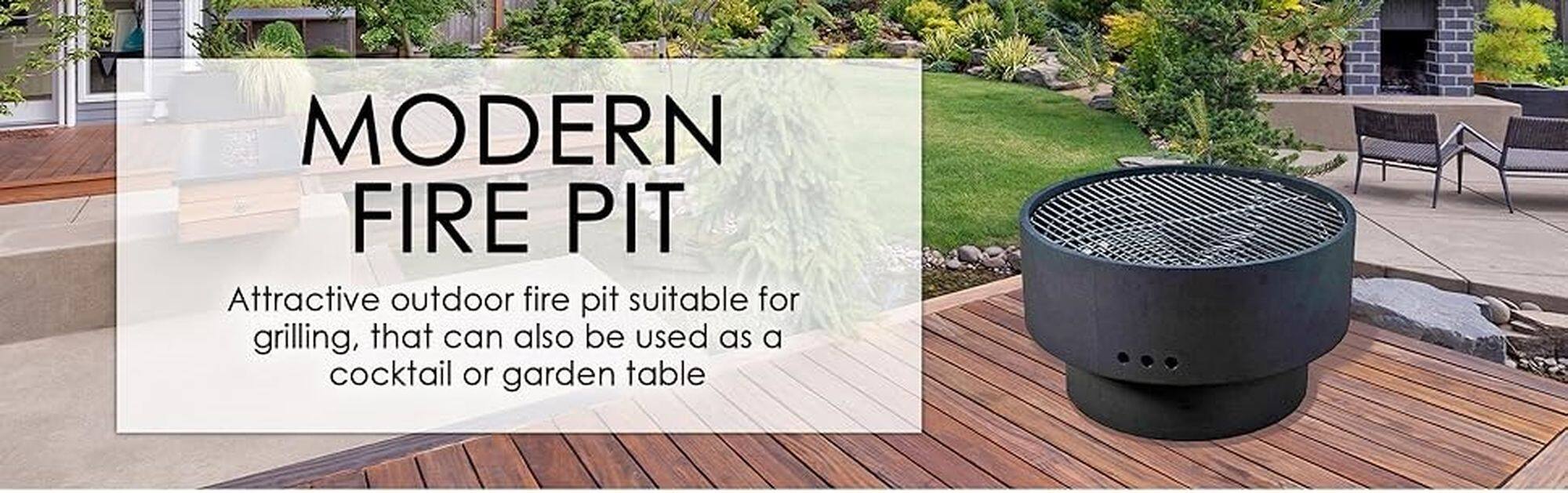My husband loves the manly look and the heavy duty ring. It also can BBQ, with included rack. It comes with a wooden topper so it can be used as a table when not in use. Love it!!