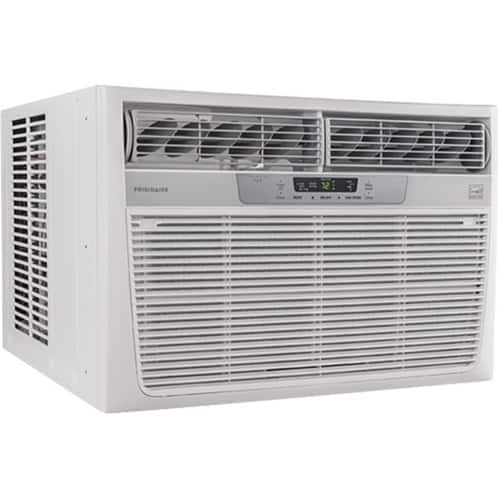 This room air conditioning unit measures just under 19 inches high by 26.5 inches wide and fits windows between 31 and 42 inches wide. This Frigidaire window-mounted air conditioner provides low noise levels and uses three different directional fan speeds.