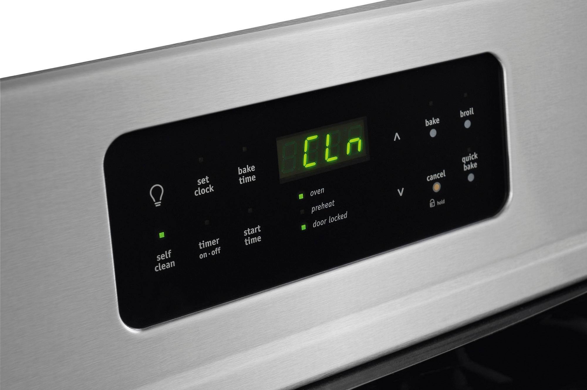 The oven self cleans, and after a month I see no build up to concern about. Love the Stainless Steel Gallery look to match and compliment my other kitchen appliances. Built in timer, and chime signals the oven has warmed up to cooking temperature.