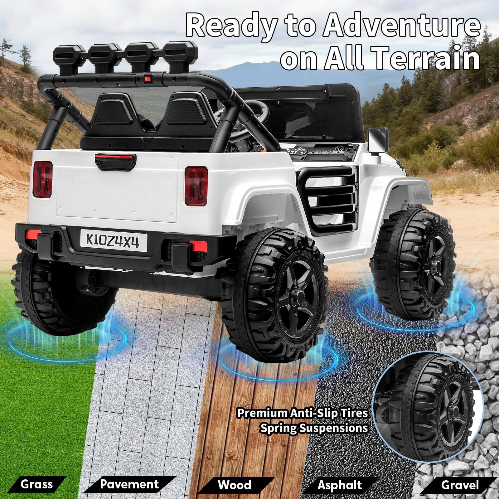 Great Jeep, our kids love it. Very sturdy, good Bluetooth connection, horn and lights are cool. Does great on grass, cement and gravel.