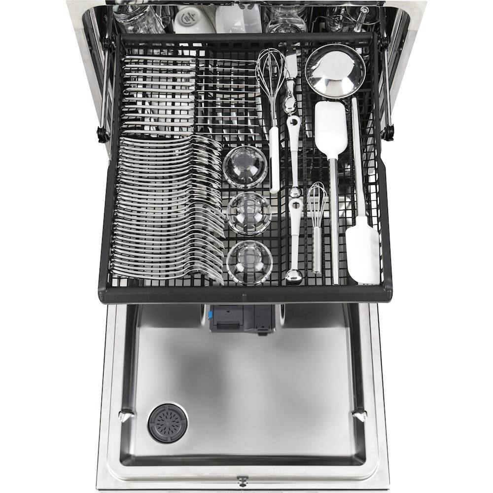 This dishwasher is so quiet! You can honestly barely hear it running. All of my dishes come out so clean. My favorite part about this dishwasher is the third rack; it is so handy to put knives, spatulas, and other cooking utensils.