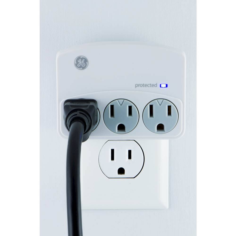The GE 3-outlet wall tap surge protector works well. Because it plugs directly into the wall outlet, no cords are in the way. It looks much neater and has room to charge 3 items at once.