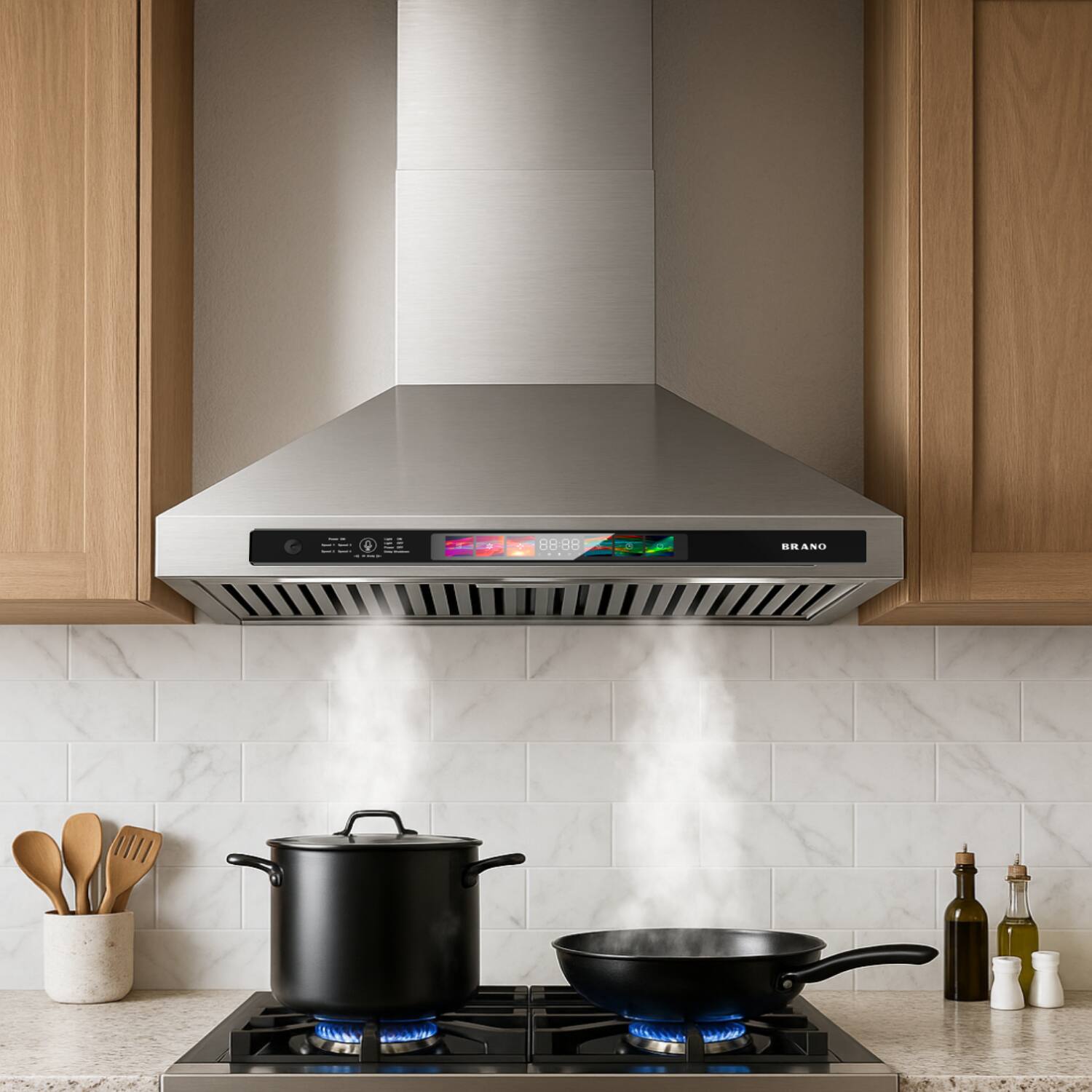 ||Posted .This reviewer received promo considerations or sweepstakes entry for writing a review.I love how this hood looks against the carrera marble backsplash in my kitchen. No complaints on function either.