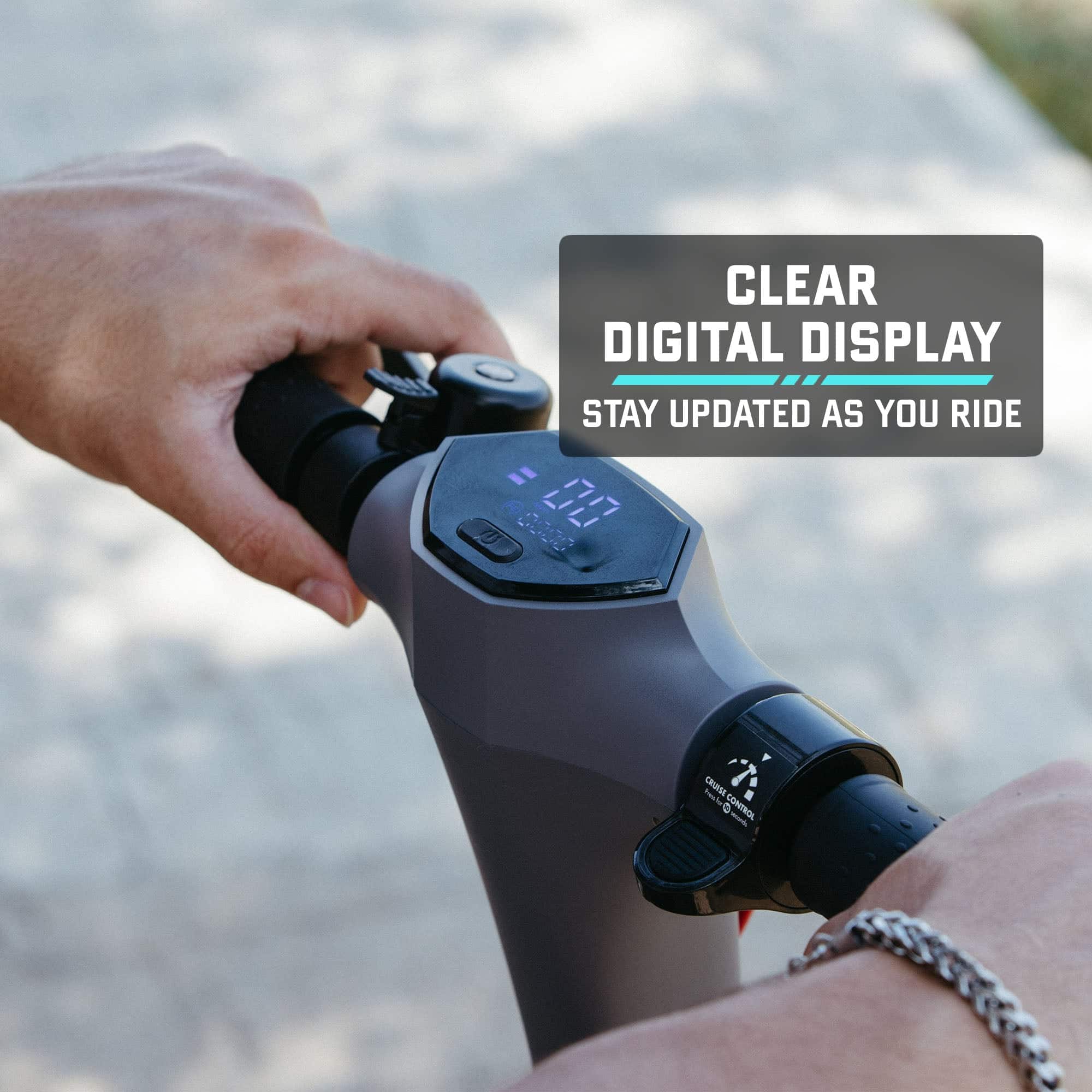 The display shows 4 bars indicating charge remaining on the battery. That's helpful, but it would be nice to see battery percentage remaining. You also have a trip meter which is easy to read and reset. It does keep track of mileage on the odometer as well. Unfortunately, when you turn off the Xr Pro, it resets the trip meter. It also has cruise control. This is a tremendous help when riding a long distance. I did have issue with setting it at times. You have to hold a speed for 10 seconds in order for cruise control to be set. This can cause an issue getting it set if you fluctuate your speed since you have to hold a speed for the 10 seconds before it sets it to that speed. It would be good if GoTrax had a button to set cruise instead.