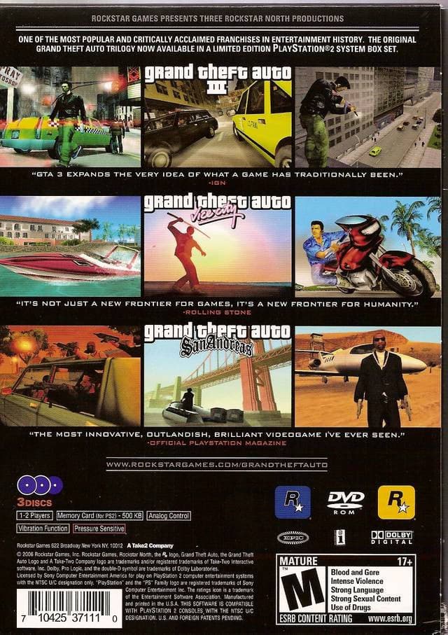Experience the birth of 3-D Grand Theft Auto up to the maximum they could manage with the PS2 in this amazing trilogy. A must have staple in any collection. This compilation will provide you with 100s of hours of fun.