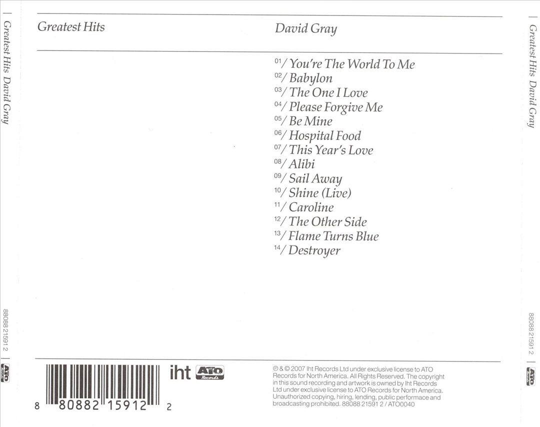 Posted .This reviewer received promo considerations or sweepstakes entry for writing a review.This CD is a great compilation of David Grays hits. One tends to miss how many great tunes this guy has produced. If you are not familiar with him, this is where to start and you will get hooked! Great listening for an evening by the fireplace with a bottle of wine!