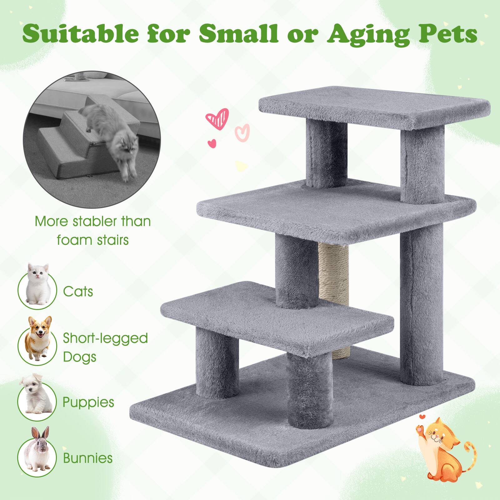 Easy to put together, soft perfect hight for my bed. So my small dog can get up and doubles as a scratching post for my cat !