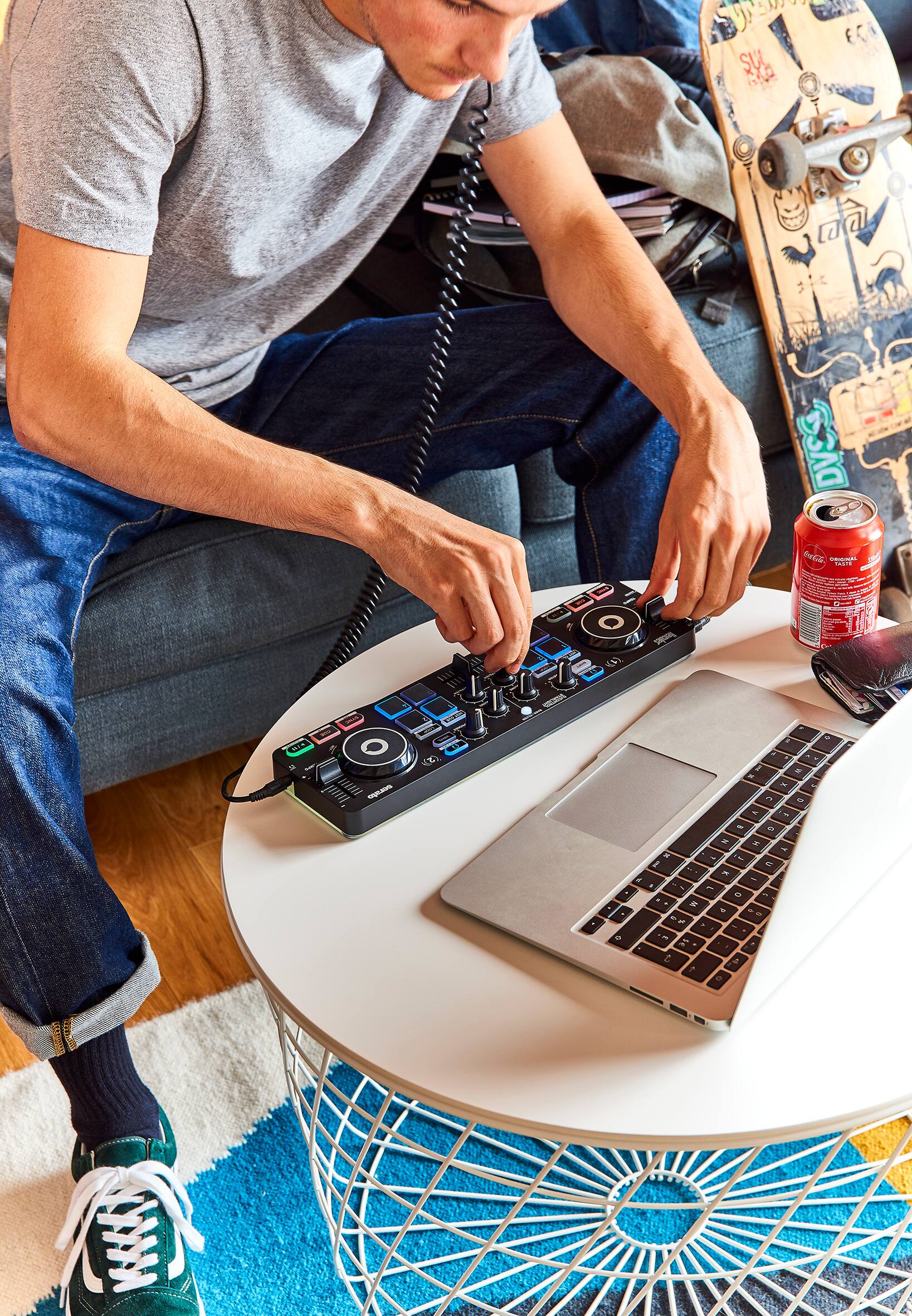 It’s a great beginners controller for compact spaces and it’s really affordable for all the functions it has. It has a built-in sound card that would allow you to use headphones and have an output to speakers. You can use it with your phone or laptop. I’ve already played at two parties with this controller.
