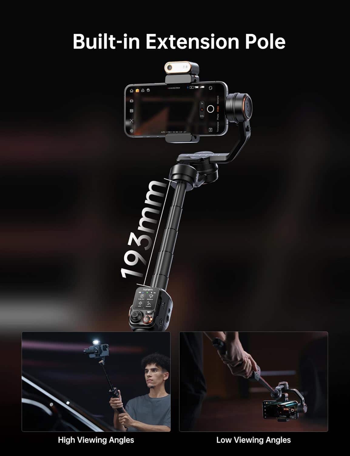 Once powered up, you grasp the handle and control the gimbal with the attached touchscreen OR the controls on the handle, OR the supplied app for either ios or android phones. The handle has a handy eight-inch extension pole, and the unit can be placed on a horizontal surface with legs extended and controlled remotely with the detachable touchscreen.