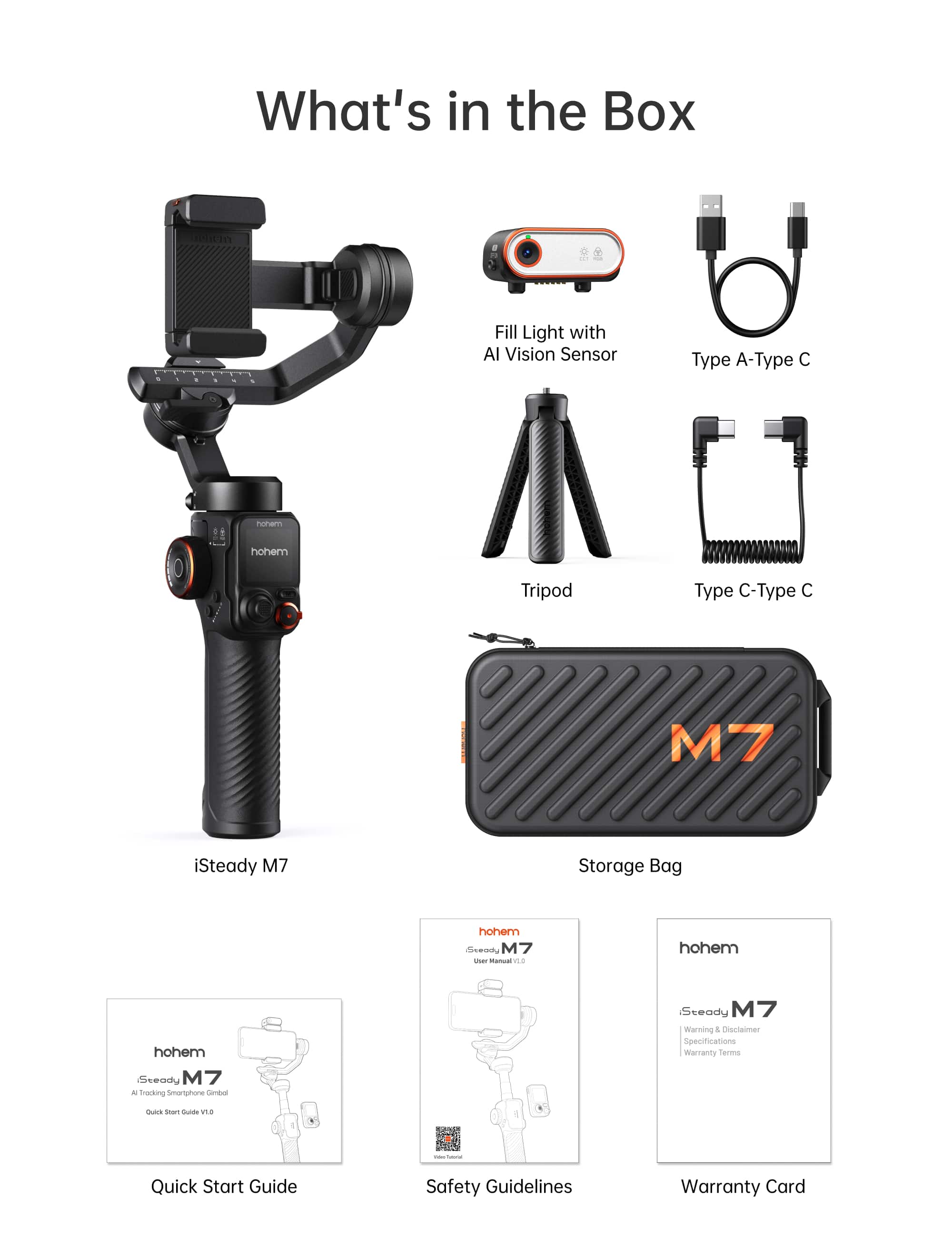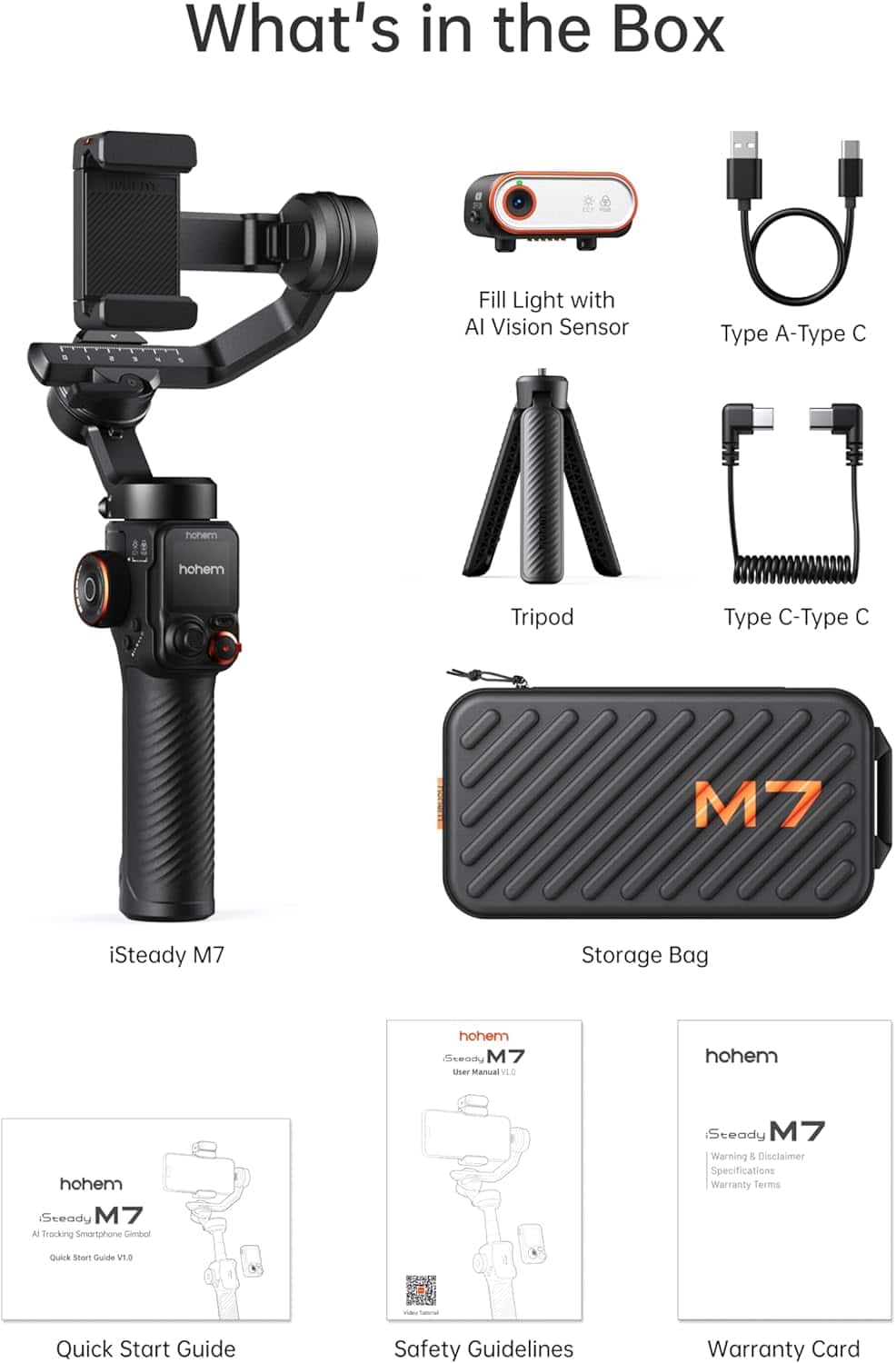 In the box is the iSteady M7 Stabilizer, AI tracker with light, touchscreen remote controller, tripod, USB-C charging cable, paperwork, and a nice semi-rigid carrying case to keep it all in. Setup is straight forward, there is a QR code on the box for the app, you'll want to install first, which will then walk you through setup and tutorials on how to adjust settings and optimize. There are also photo editing options within the app for additional content creation features.