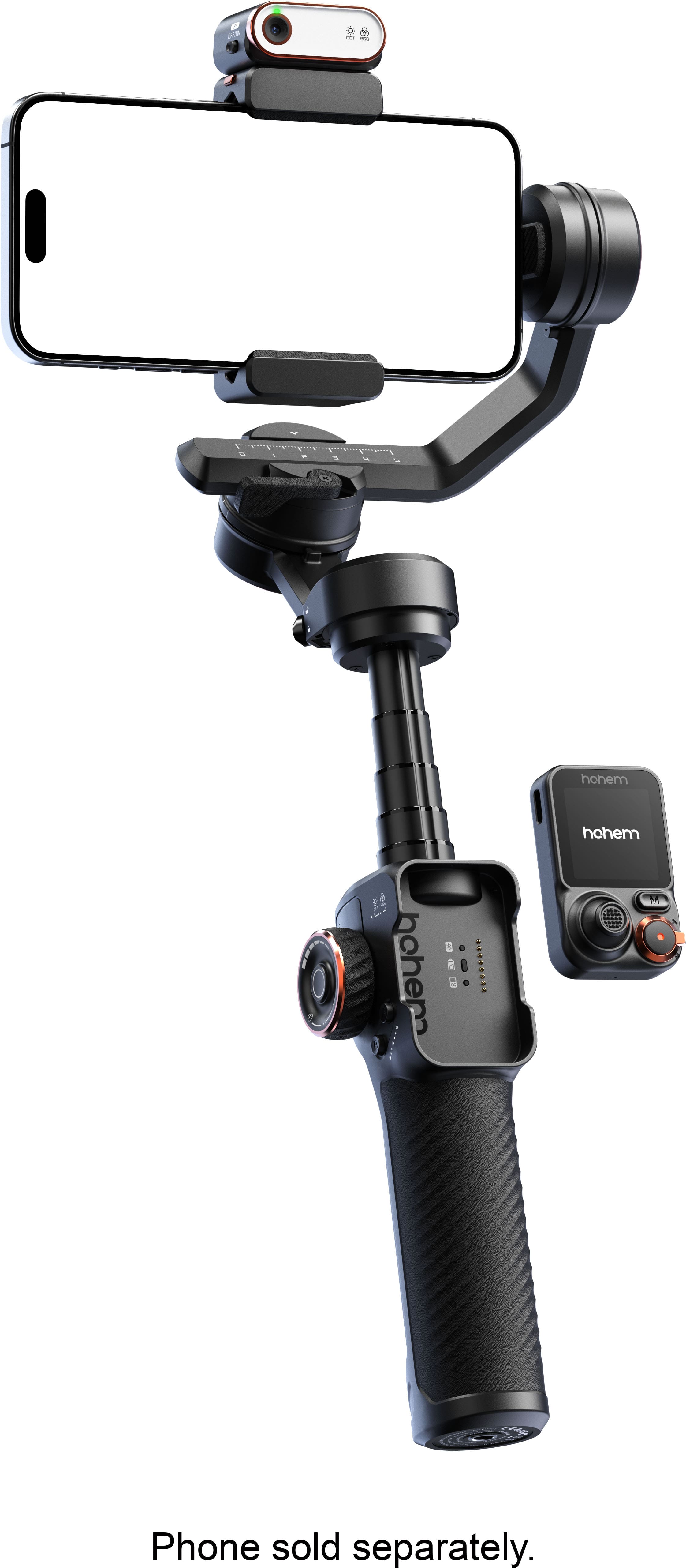 The side control wheel can be configured for pan, tilt, or roll. When connected via Bluetooth to the Hohem Joy app, it supports focus and zoom adjustments. The remote controller is packed with well-placed features that can be accessed quickly without digging into menus mid-shoot.