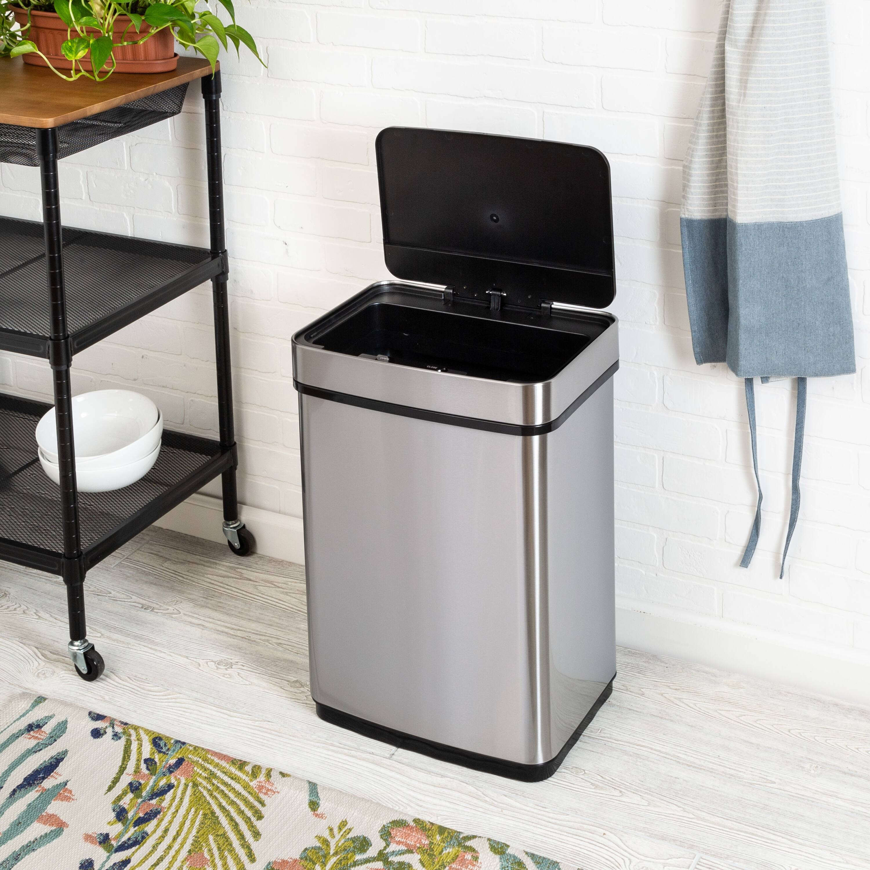 We love are new garbage can looks good in are kitchen .Love the size of it .Works great,just put your hand by it and it opens up .
