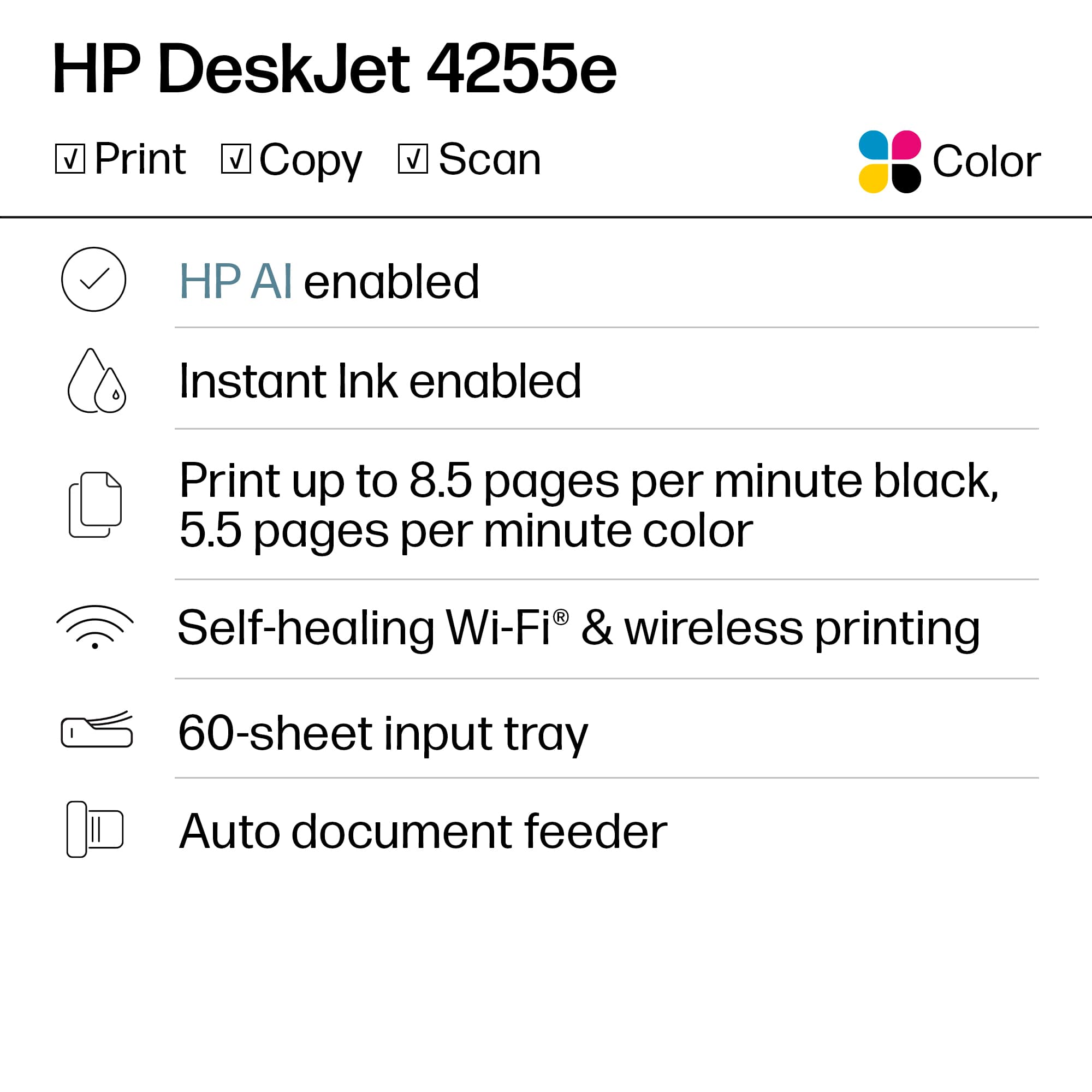 The HP DeskJet 4255e is a solid all-in-one printer that delivers good performance for everyday home or small office use. The wireless setup was quick and easy, and I love being able to print from my phone or laptop without any hassle. The print quality is sharp for documents, and decent for photos, though they won’t be gallery-quality.