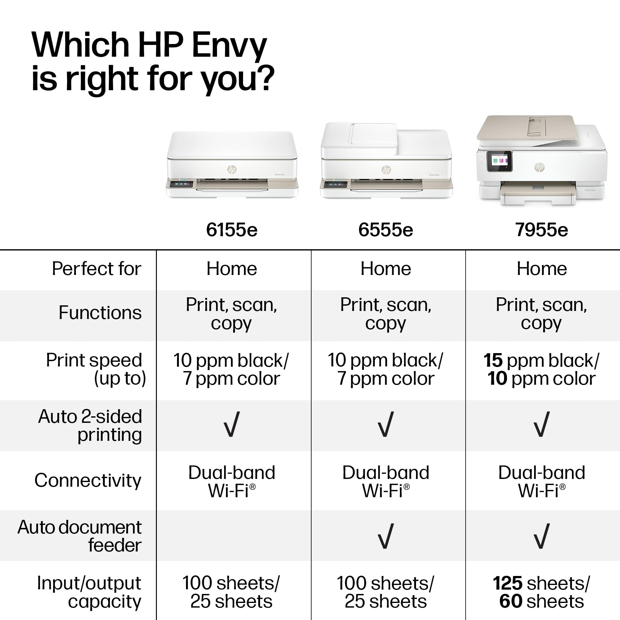 Customers express satisfaction with the Envy 6155e printer's print quality, ease of use, and straightforward setup. Many appreciate its compact size and convenient connectivity options, allowing for seamless printing from various devices. Positive feedback also highlights the printer's quiet operation and overall performance for home use. The stylish design is another frequently praised aspect of the product.