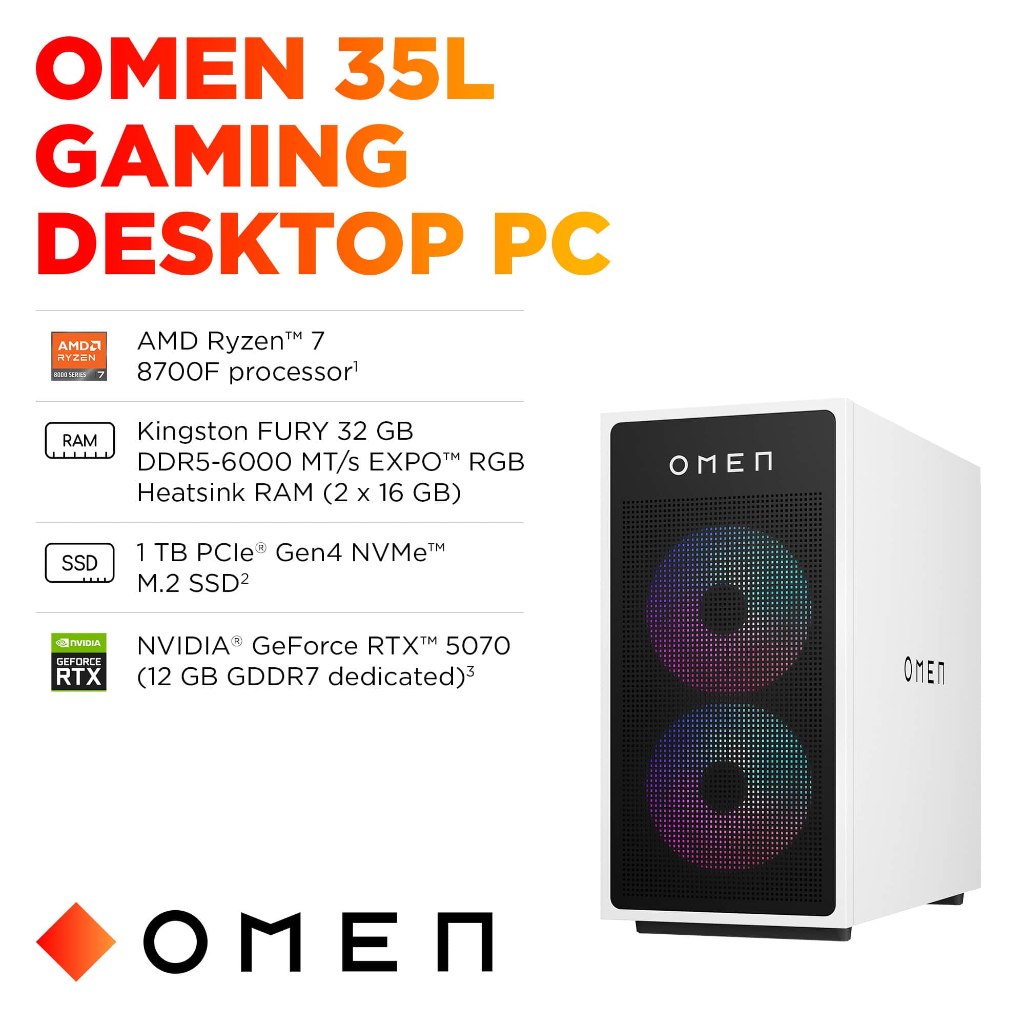||Posted .This reviewer received promo considerations or sweepstakes entry for writing a review.I’ve been using the HP OMEN 35L with the Ryzen 7 8700F and RTX 5070 for a little while now, and it has been excellent. The system starts up quickly, runs very quietly, and handles everything I do without any slowdown. Games run smoothly on high settings, and multitasking feels effortless with the 32GB of DDR5 RAM. The build quality is solid, and the design has a clean, modern look. The cooling seems well designed because the desktop stays cool even during longer gaming or editing sessions. The 1TB SSD is also fast, so loading times are basically instant. Overall, this desktop has been reliable, fast, and exactly what I needed. Very happy with the performance so far.