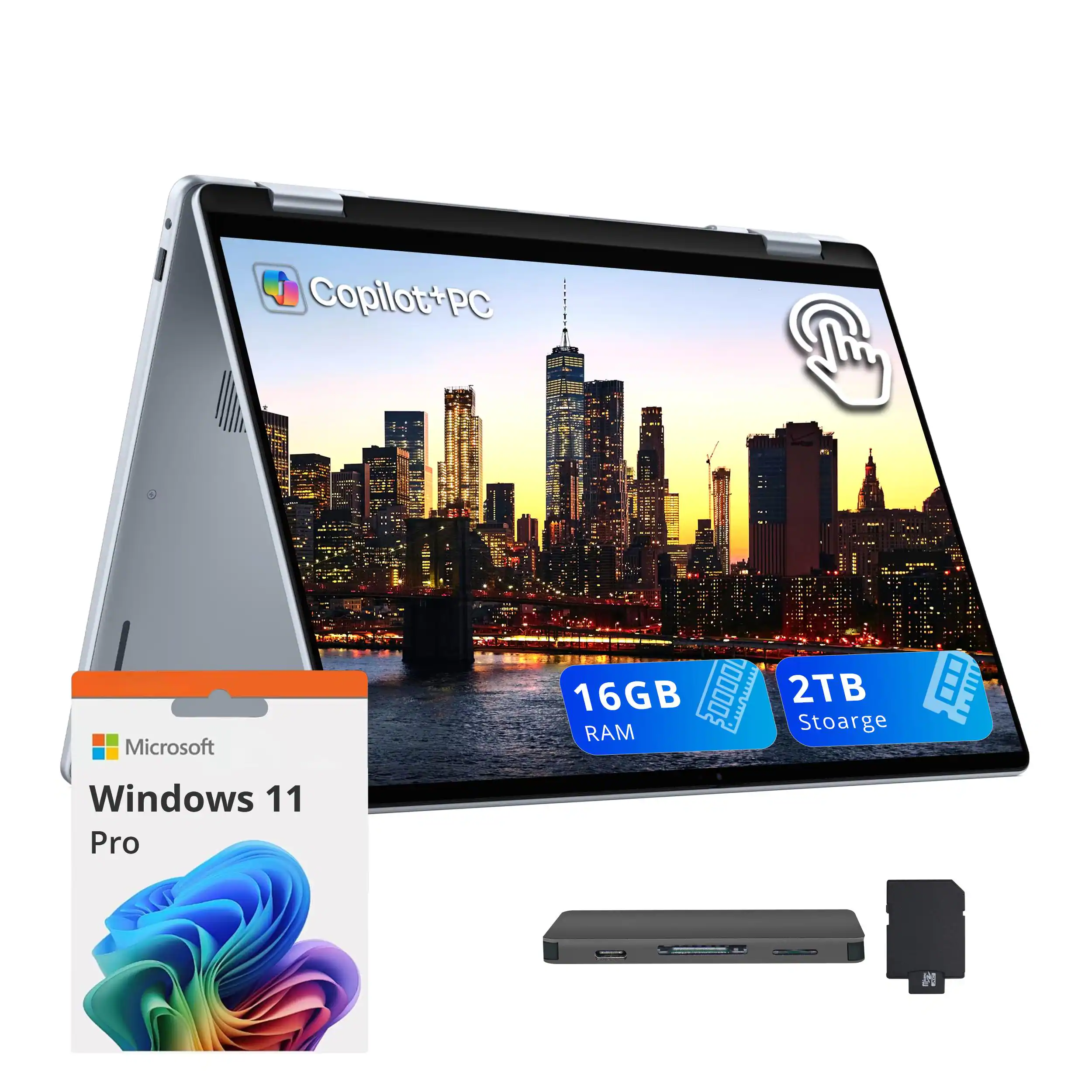 The 2-in-1 designation means the laptop has touch screen and can be used in tablet mode or tent mode. It comes with a leather-like sleeve that accommodates the included HP rechargeable Tilt Pen.