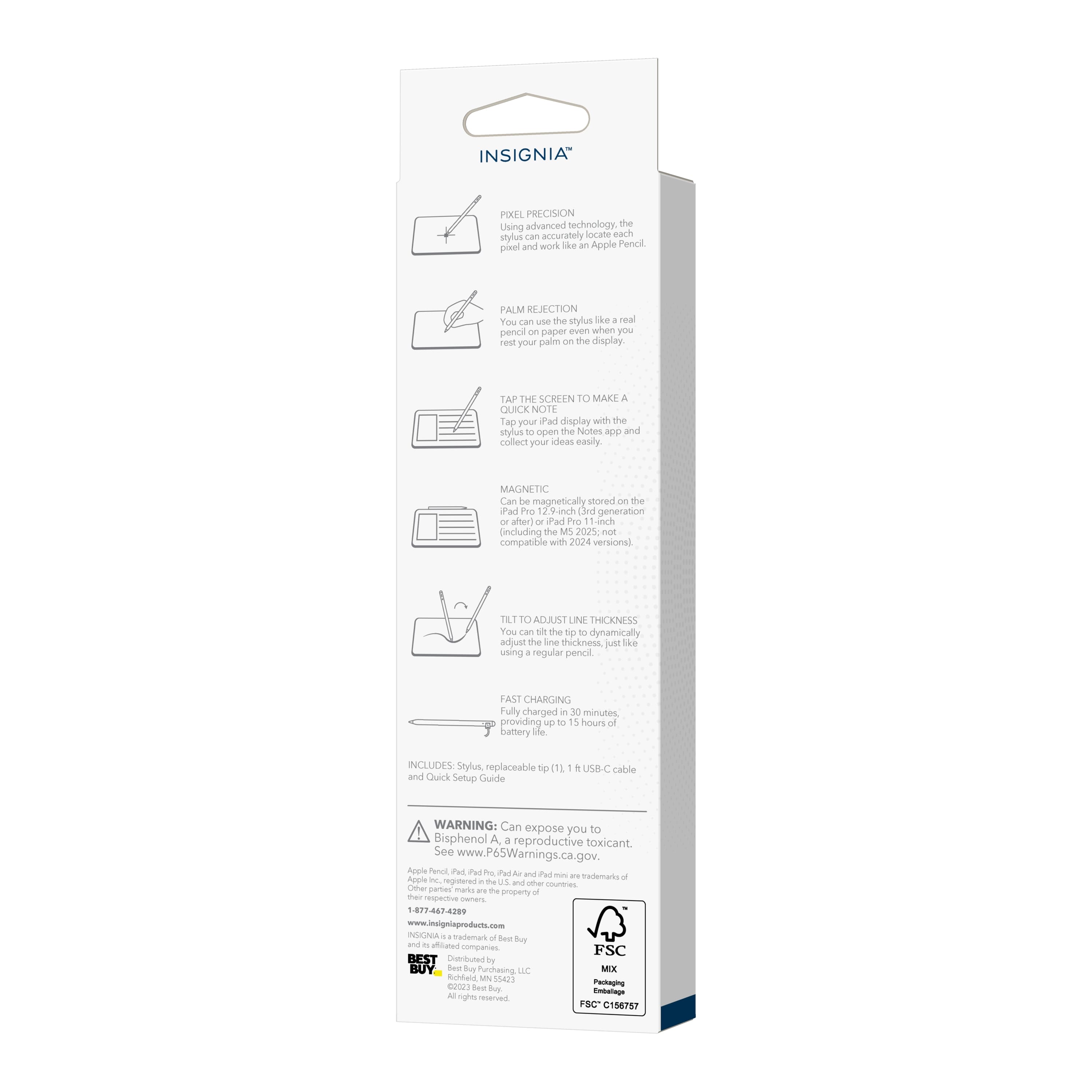 |Posted .This reviewer received promo considerations or sweepstakes entry for writing a review.First the price point is very good and with a sale becomes phenomenal. No pressure sensitivity but hey the low price means that feature would be excluded. Another thing you get is an extra stylus tip but be careful when opening the bag with the charging cable as it is easy to lose the stylus tip if you rip the bag open. Also instructions says to double tap to turn on/off and I was double tapping the tip but it is really the top that must be tapped twice to turn on. I do light the charging light to let you know it is charging. It is Compatible with iPad Pro, iPad Air, iPad and iPad mini since 2018. The Magnetic support means it can easily stick to your iPad Pro 12.9" (3rd generation or after), iPad Pro 11", iPad Air 5, iPad Air 4, (iPad 4rd generation or after), or iPad mini 6. I like that it charging is via a fast USB-C cable and fully charges your stylus in about 30 minutes and provides up to 15 hours of battery life. The Battery indicator light lets you know when your stylus is close to needing a recharge. What's Included Insignia™ Active Stylus for iPad, iPad Pro, iPad Air and iPad mini Replaceable tip (1) 1-ft. USB-C cable Quick Setup Guide