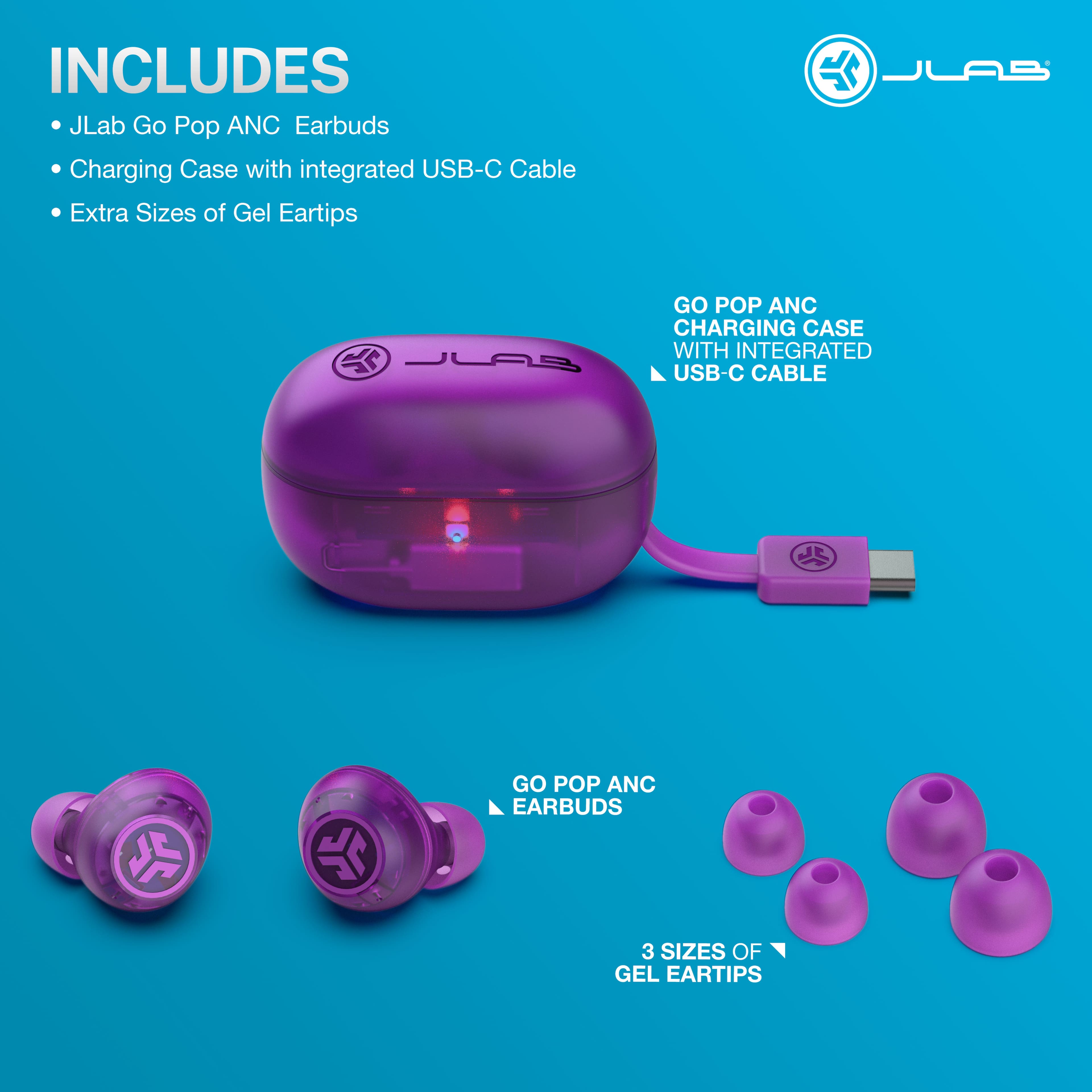 As for the design of these JLab GO Pop ANC True Wireless Earbuds, well ... the translucent purple color is awesome. They are really really pretty! The charging case is tiny and compact (easy to tuck away inside a pocket, purse, or backpack), and has it's own USB-C short cable attached to the case itself. This is a handy feature I'm familiar with from my other JLab earbuds.