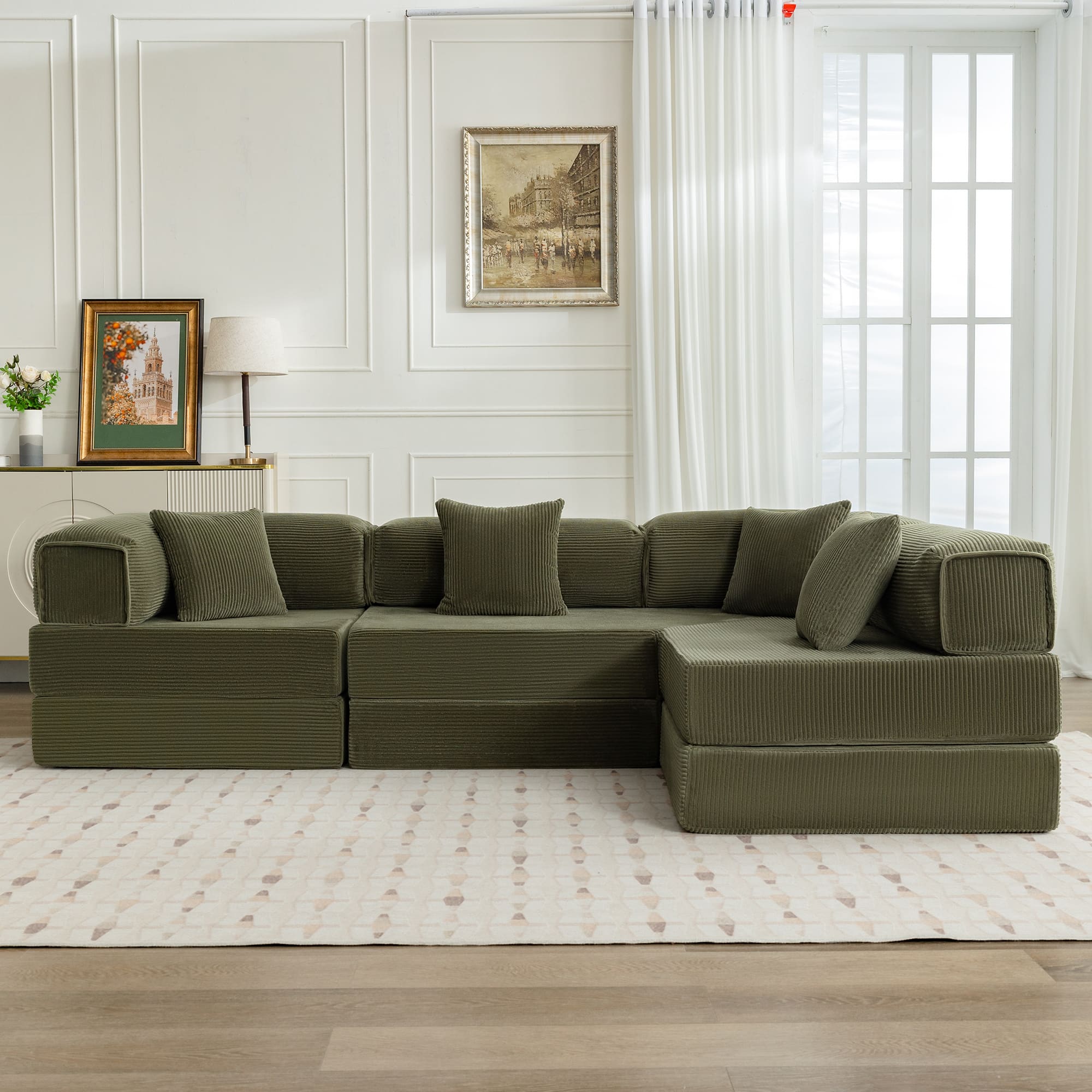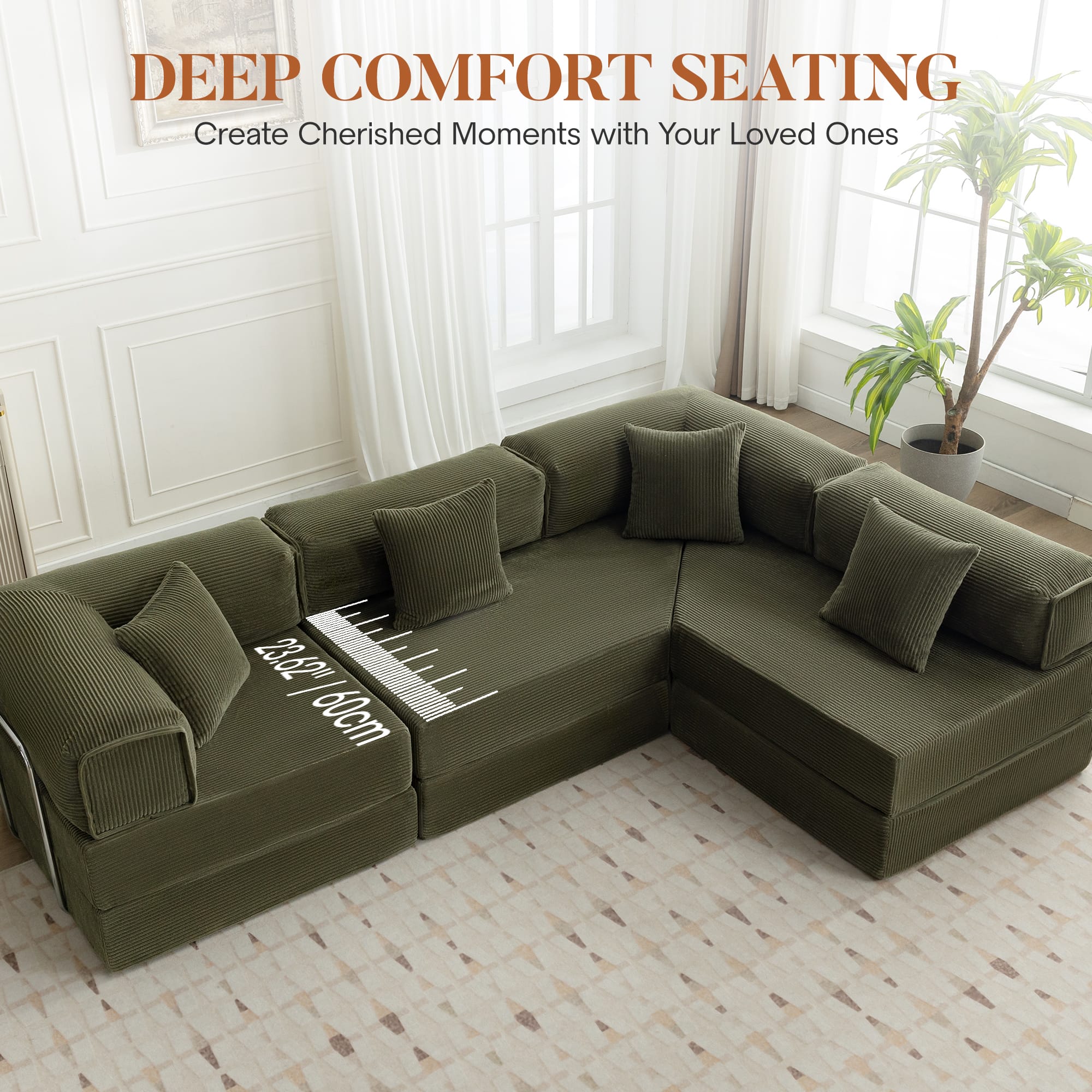 Got this sofa for my loft space, works perfectly with our layout with its low profile and wide spread. The cushions expand almost immediately when you open the plastic seal but directions say wait 2 hours. There was no noticable smell, the interior material is firm and durable. The exterior material is soft but also durable. We have it against a wall so the pillows allow for more support on top that way. Its great quality. Its ideal for laying down on and having guests sleepover, and was packaged very well, able to fit up any stairwell or through any doorway while packaged, and they wre lightweight. Two people would be needed to carry each package with ease. Comes in two packages. The back is low for tall people so if you’re looking for something with solid upper back support without a wall to keep it against it may be too low profile for you but it works great in my top floor space with a lower ceiling.