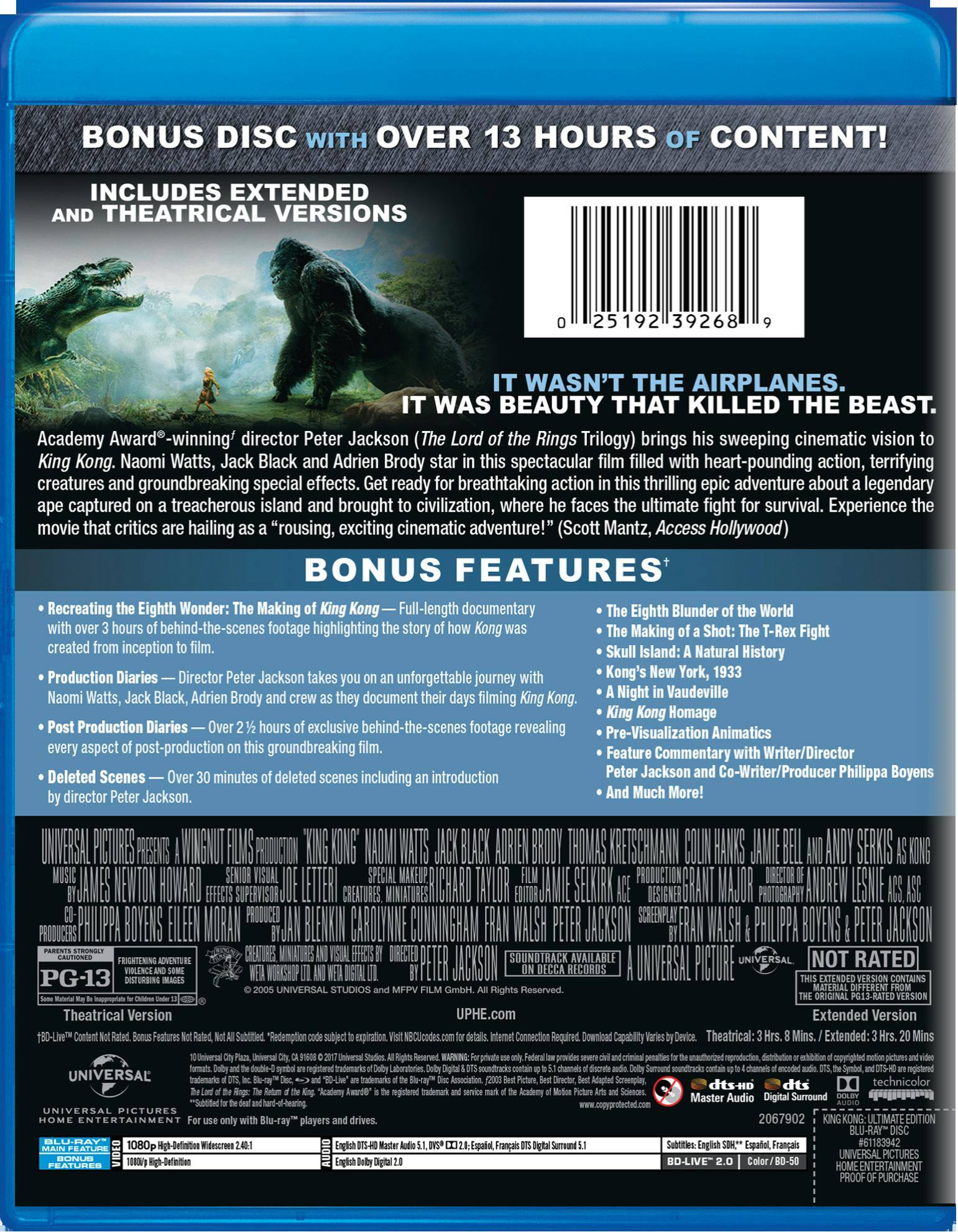 Naomi Watts, Jack Black Adrien Brody and a Gentle giant (Peter Jackson) with the late, great Andrew Lesnie managing visuals embarks quite literally on a quest to find an island stranger than any other, in this the penultimate (as of 2019) Hollywood retelling of the myth of the blonde and the beast on Skull island. Jackson as his usual shot a longer movie than its distributors wanted to show on theaters. This blu ray runs longer by roughly a dozen or so of minutes. Included on this edition is the theatrical cut also. So if you enjoyed the film before, and is quite amusing, and have ever been curious of what did Jackson really wanted to tell, this is the best edition to get great price-value ratio.