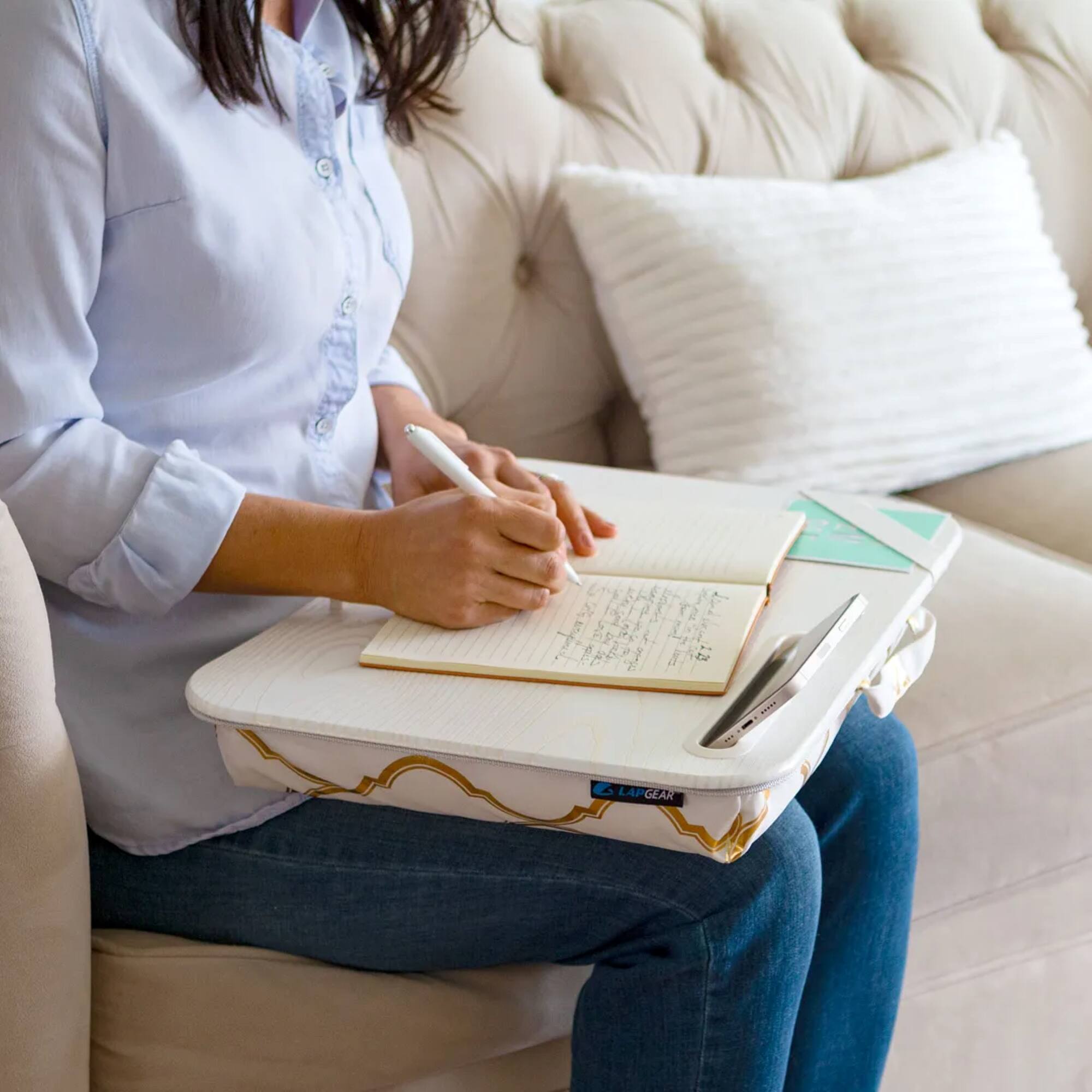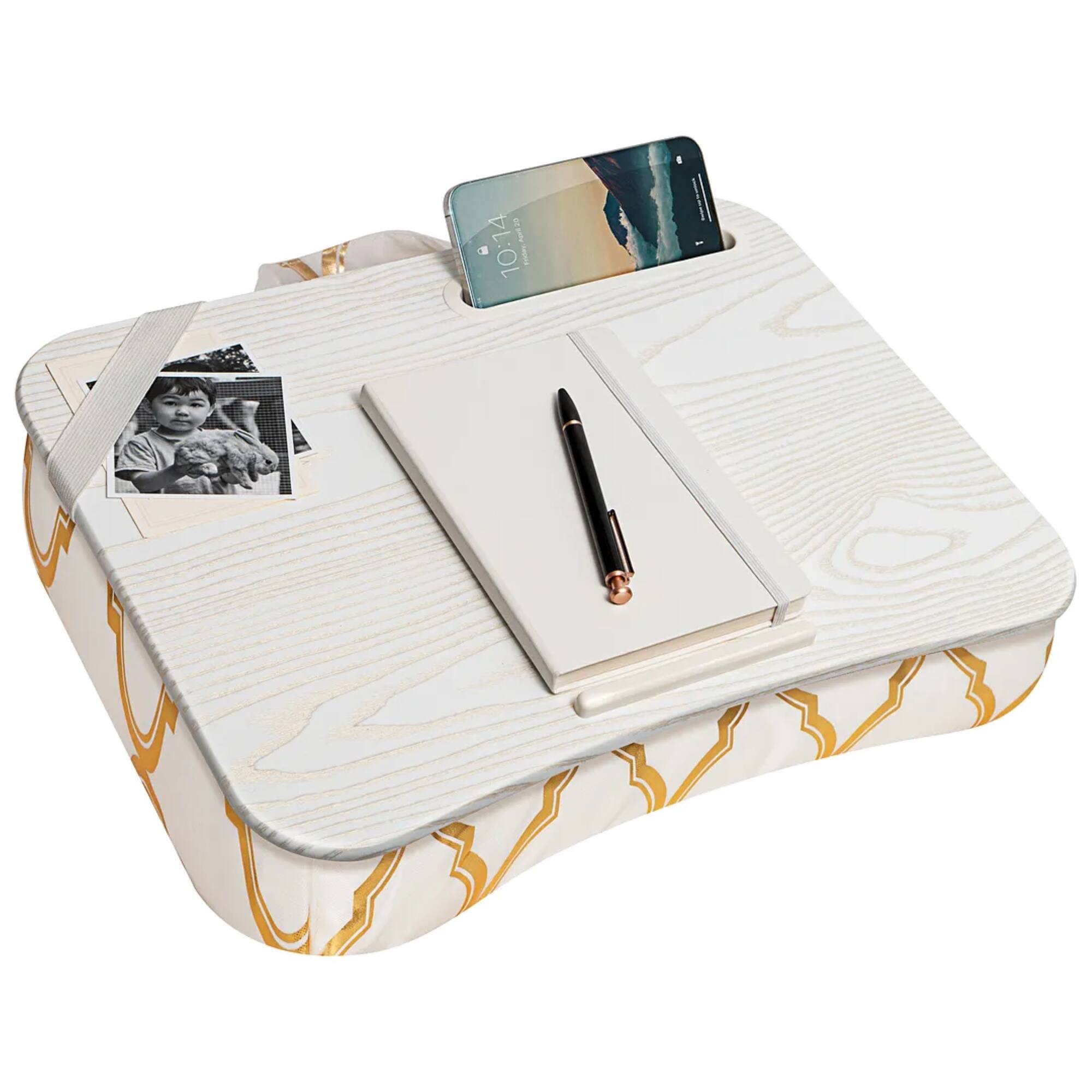 Purchased to replace my really old lap desk. Has worked well when doing work or personal computing from the couch. The slot for holding a phone or pen is a useful feature, and the bar to hold the computer in place is great. Have also used for non-computer tasks when I don't want to sit at a table or desk.