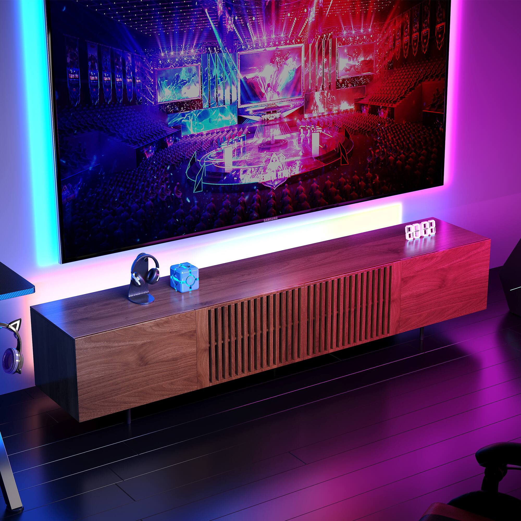 Looks great! Functions flawlessly. The delivery and installation of this unit with the TV went smoothly. Geek Squad staff who delivered the TV and this unit were careful of our newly installed floor.