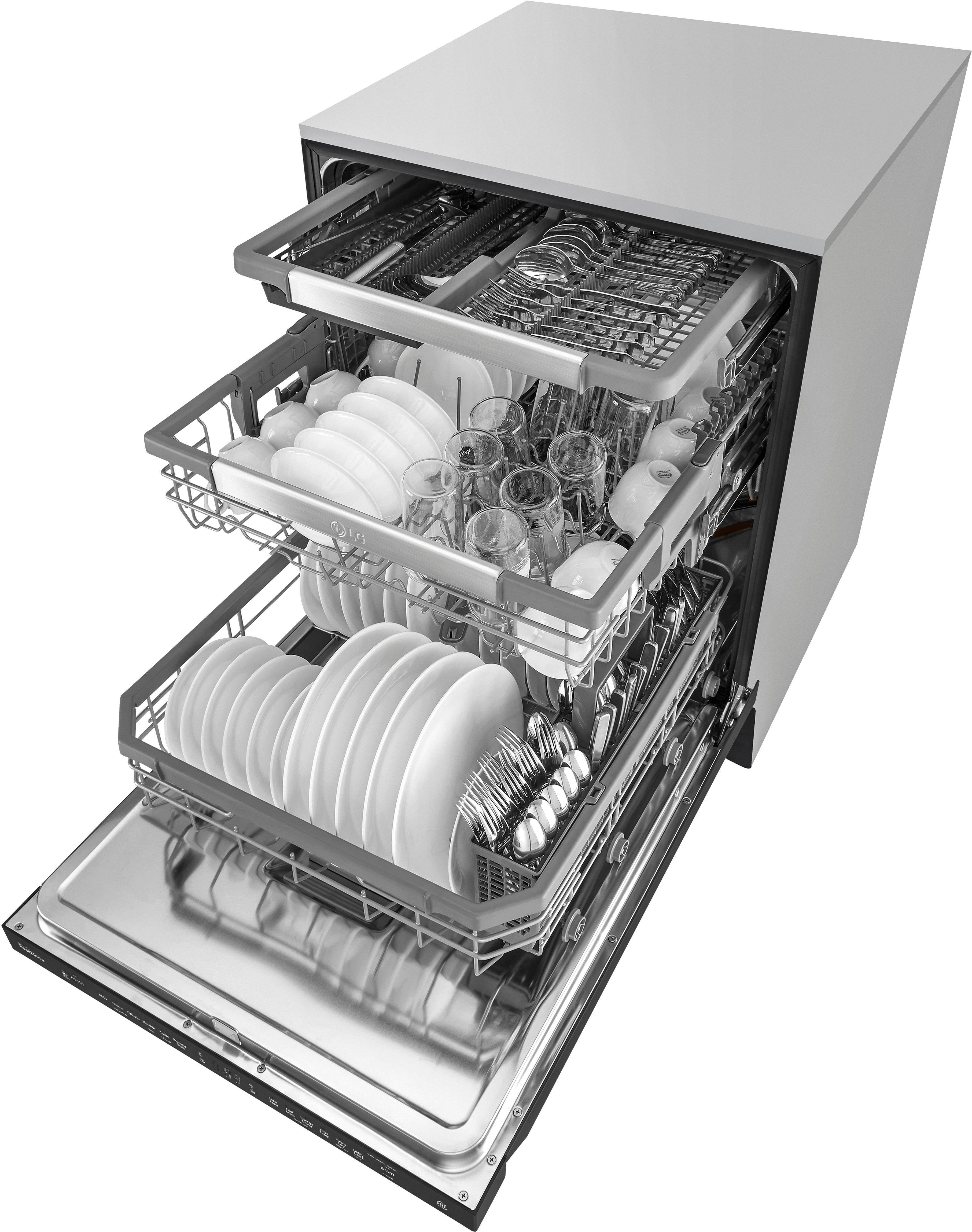 Thrilled with this LG dishwasher. Read all the reviews beforehand plus downloaded the manual. I researched many models, then took my pots, dishes, & glassware for a practice load in my local Best Buy. The first 5 model tryouts were disappointing BUT then came this LG Quad-wash model which suits my needs to perfection. The adjustments for racks and tines are beyond fabulous. The third rack on the very top has adjustments that the more expensive Bosch did not have. Three positions for the middle rack serves every purpose I have tried out so far. The quiet is a little eerie since our old dishwasher was deafening. Many complaints in other reviews seemed easily remedied by reading the instructions carefully. Consumer Reports gave shockingly low ratings that seem wholly unjustified. Whether loaded with pasta pots, dog bowls, oversized mugs, or dainty glass salad bowls, the cleanliness is perfect. I can even put plastic/silicone cutting boards in with no worries. Washing status is easily visible on top. Drying works very well with the stainless tub. Some of my mugs have 'pockets' that collect water, BUT the water residue is CLEAN unlike my old dishwasher. This equipment gets my highest recommendation. It was a Black Friday sale purchase (ahead of time) and Best Buy discounted a further 10% for my military service. This dishwasher has a manually cleaned filter which also makes it superior to my old machine. After testing each cycle that is offered I verified the results advertised. My handyman did the installation carefully following the instructions. It was so easy I could have actually done it myself. This dishwasher is so well-engineered that you can adjust the height at the back of the machine for leveling purposes from THE FRONT! What an aggravation-saver!!! This LG model is impressive with a short learning curve to boot. Do yourself a favor and check it out!