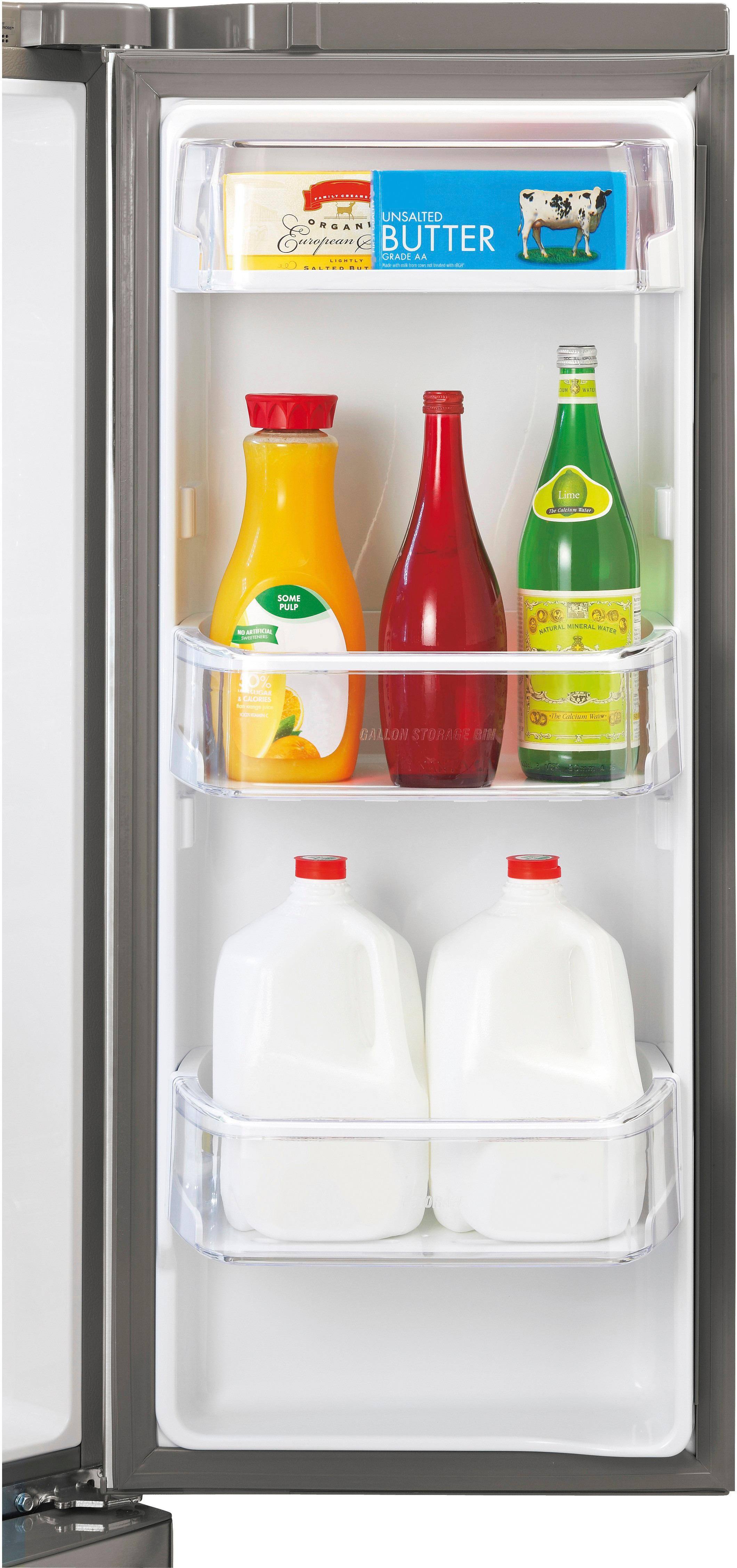 1. Positive - The fridge holds lots of food. Two of the right door shelves are large enough to hold 2 gallons each.