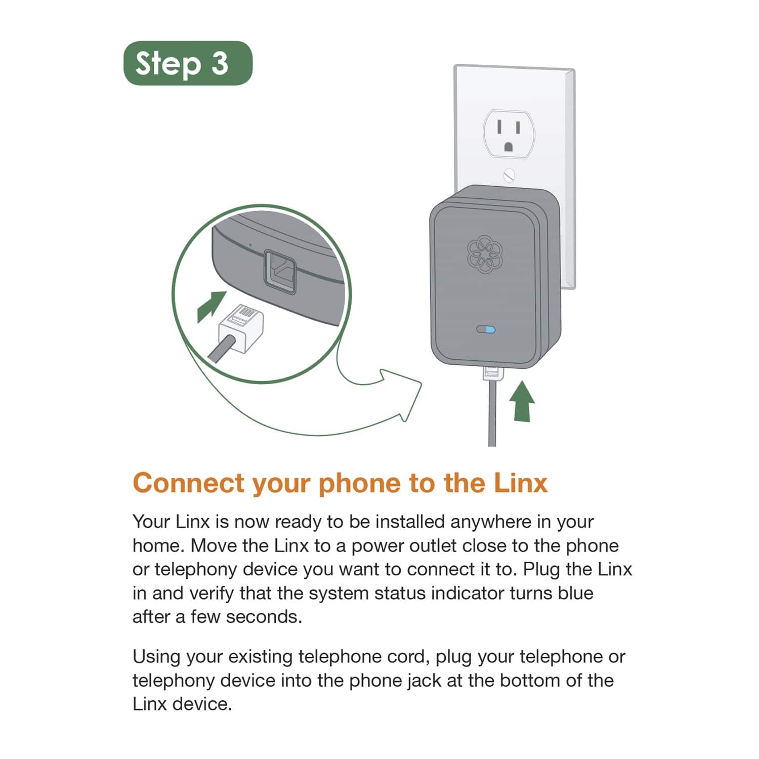 The linx device makes it easy to add lines to the Ooma system. Just pair it with the Telo base and then plug it in.