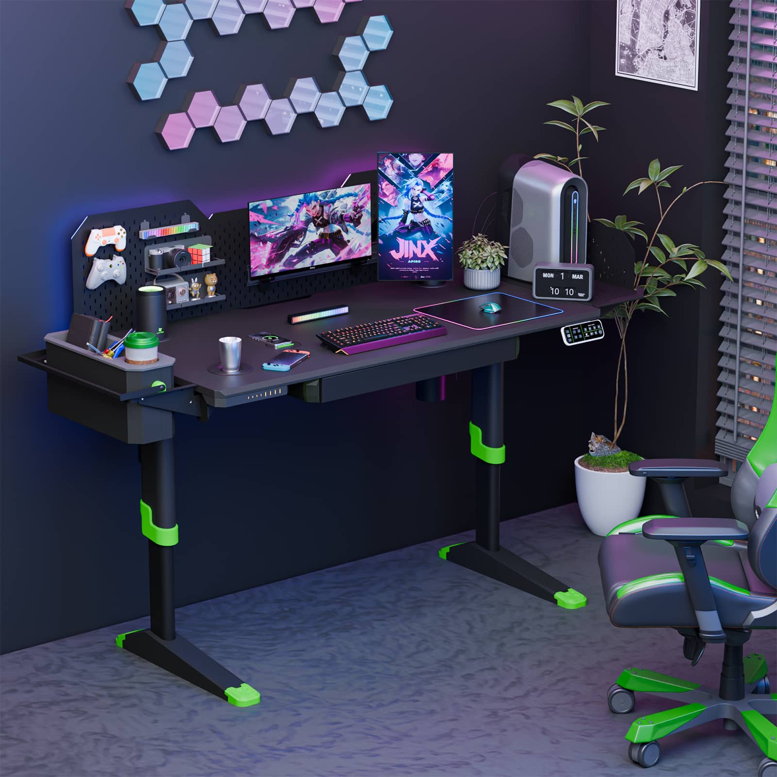Once assembled, this desk blew us away. The lift is smooth and quiet—I adjust it dozens of times a day without a second thought. The storage drawer is deeper than expected, perfect for hiding clutter. The wireless charger works every time, and the RGB lighting makes late-night work feel less like “work.” The pop-up Bluetooth speakers are the best part, this is essentially the same experience as the Mercedes S class pop up speakers. Lifting up the speakers is the first thing I do every time I start working or gaming.