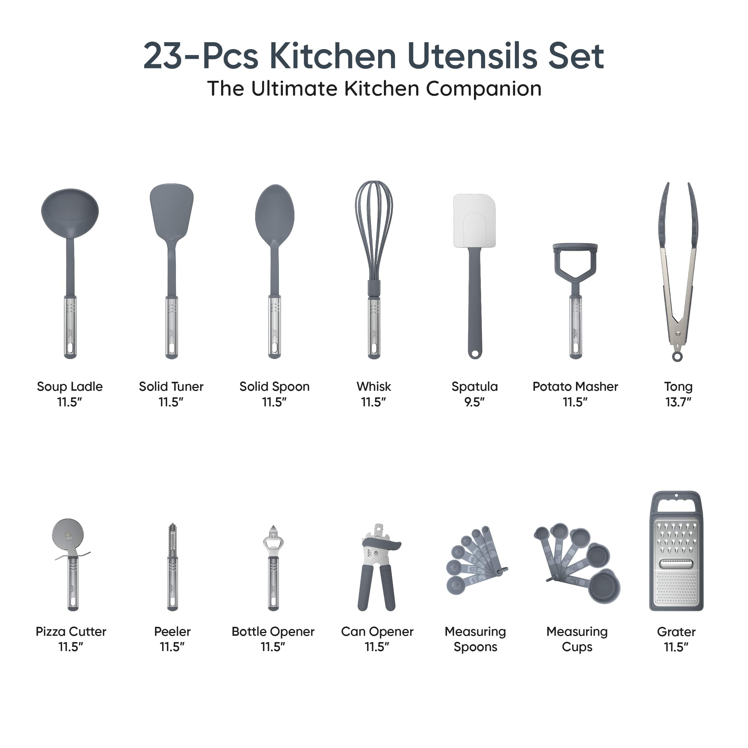 Very poor quality. The can opener is so dull it doesn’t cut. The potato peeler is useless. The material is also rather thin, and bends when used to stir something thick. I’m so disappointed. The only reason for 2 stars is because the set “looks” nice, not very efficient though.