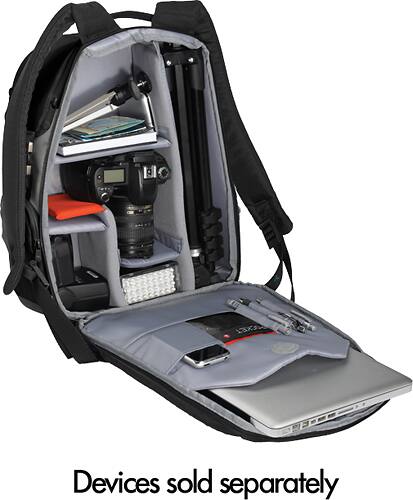 This backpack has a place to stash just about everything you need for a single-camera DSLR setup. We have loaded it up with a DSLR body, two small lenses, one large lens, a speedlight, laptop, and various other accessories. Quick access to everything. Only complaint is that the backpack straps must be pushed out of the way in order to open the main flap, and they don't stay out of the way. This is a minor inconvenience.