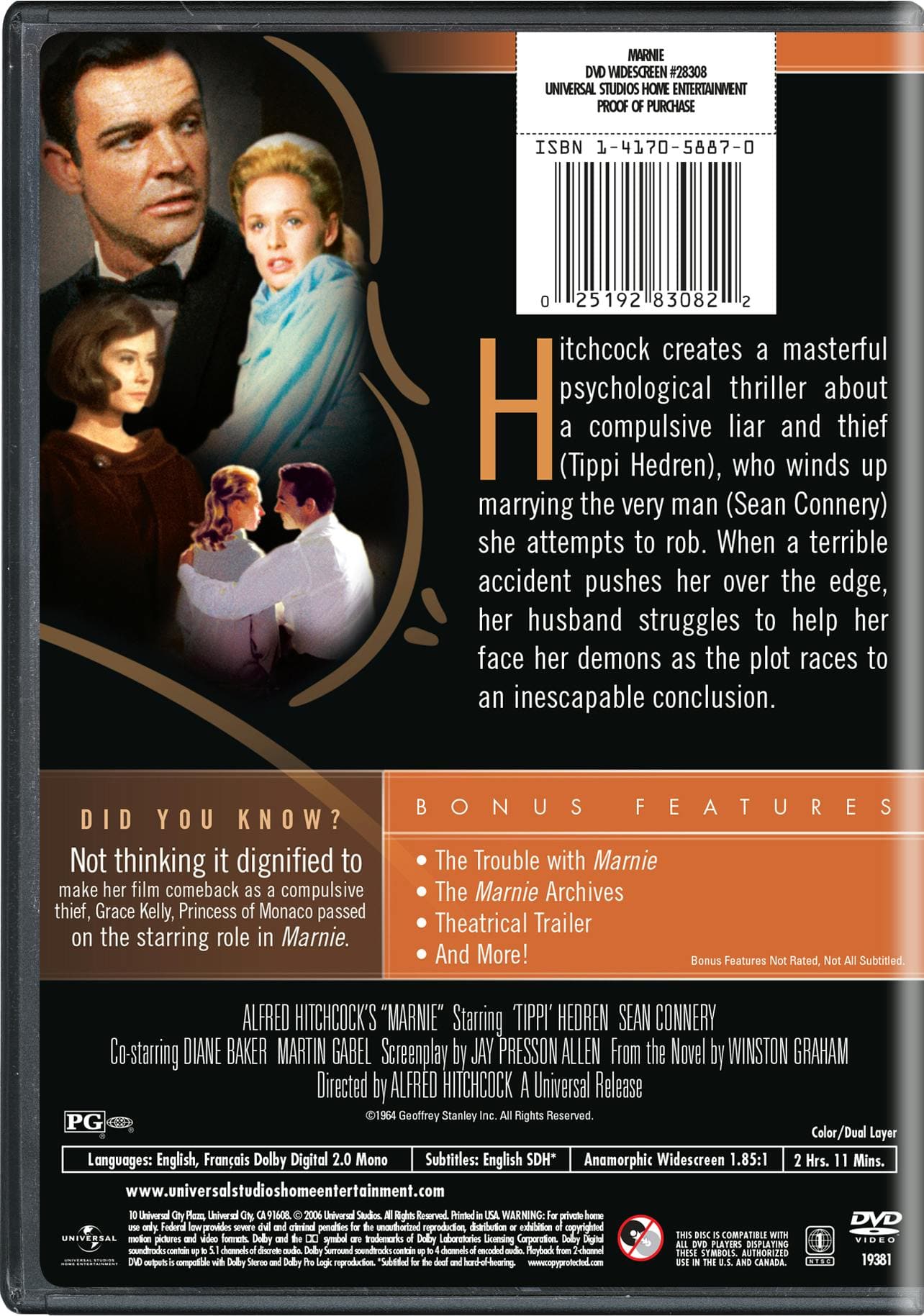 Marnie was the first great non-Bond film from Sir Sean Connery since he began playing his career-defining role as 007. This was also Hitchcock's followup to his classic The Birds, with the same leading lady, Tippi Hedren.