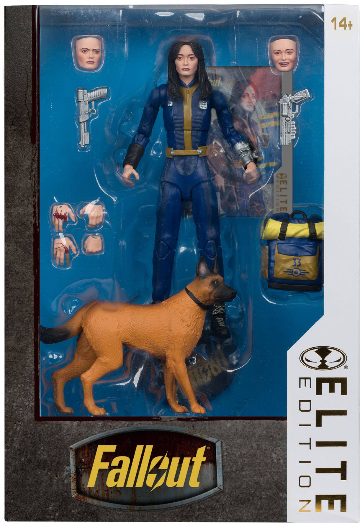 McFarlane Toys Elite Lucy figure from The Fallout television series. I wasn't sure what to think of this figure when I looked at it in the Box, once I got it out and looked at the extra faces and put everything together it did look a lot like Lucy from the TV series. She's articulated pretty well the only gripe I have is she comes with the dog and the dog does not articulate. This is supposed to also be a premium figure which it did come with a few extra accessories, but I do not think it's worth much more than the other figures in the series, I do feel like it's overpriced, but it's still a great figure to have for any Fallout fan.