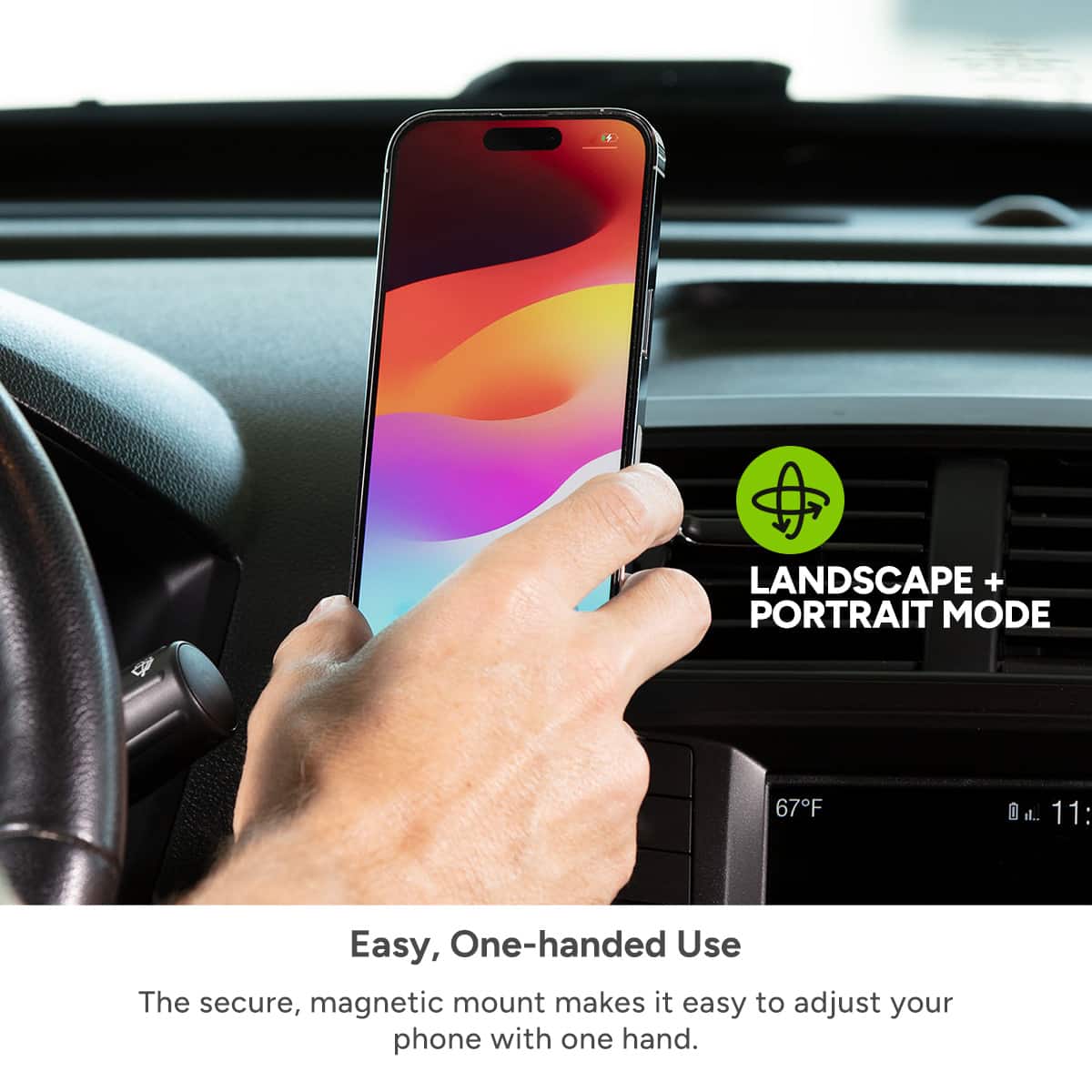 Lots of good positioning options and easy to use and place where desired. MagSafe system works well and holds phone sturdy on the mount. Works best in a portrait position vs landscape. Consider where your vents are before purchasing as there are limitations.