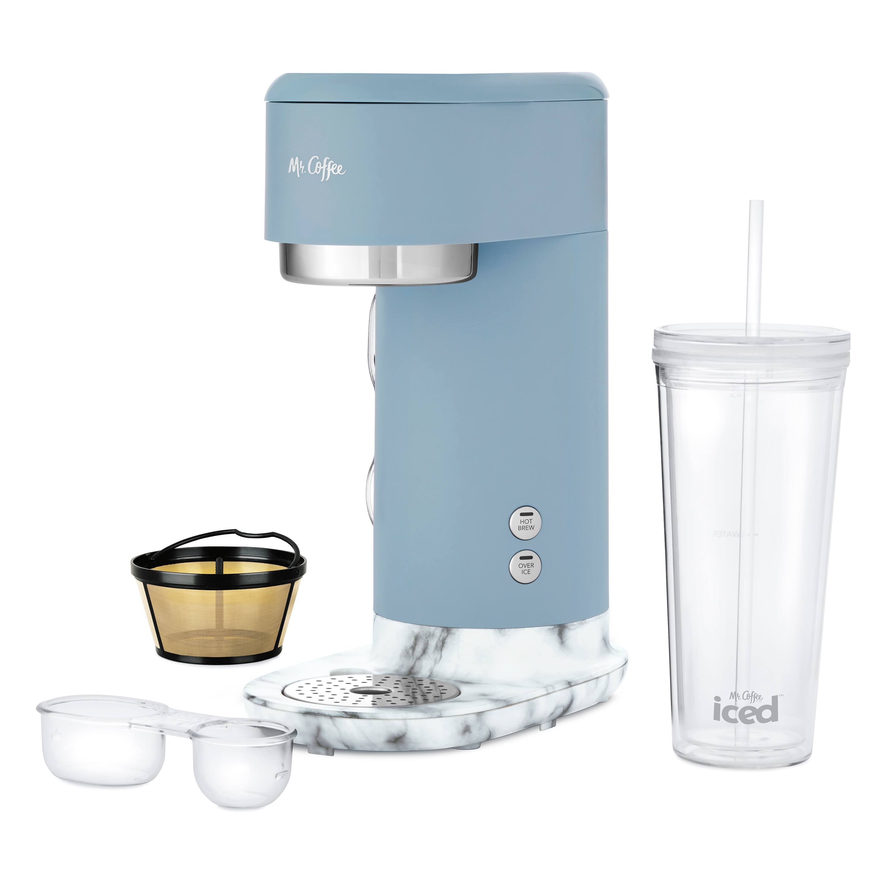 MR. COFFEE SINGLE-SERVE ICED AND HOT COFFEE MAKER WITH REUSABLE TUMBLER AND GOLD TONE COFFEE FILTER, BLUE AND MARBLE